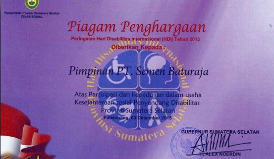Palembang, PT Semen Baturaja (Persero) Tbk yang diwakili oleh Direktur Umum & SDM PTSB Romlan Kurniawan, SE pada hari kamis (03/12) menghadiri undangan dari Gubernur Sumatera Selatan pada acara peringatan Hari Disabilitas Internasional se-Provinsi Sumatera Selatan Tahun 2015. Acara ini mengambil tema “Wujudkan Masyarakat Inklusif Melalui Undang-Undang Disabilitas dan Strategi Multi Sektoral”.