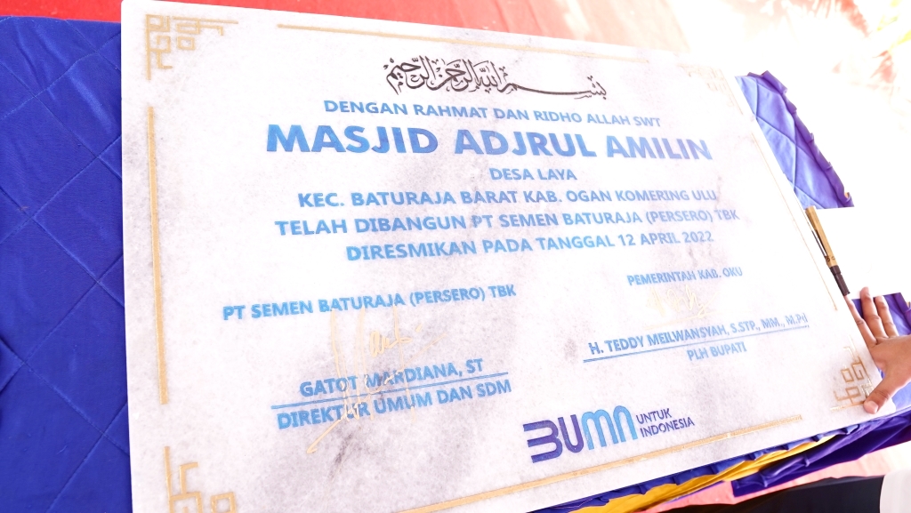 PLH Bupati OKU H. Teddy Meilwansyah., Menyampaikan Masjid Adjrul Amilin pasti sangat membanggakan karena merupakan wujud kepedulian PT. Semen batuaja terhadap kesejahteraan dan kebutuhan sarana ibadah terhadap masyarakat sekitar.