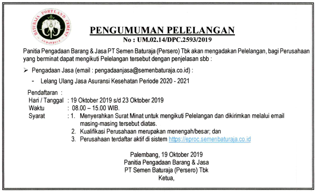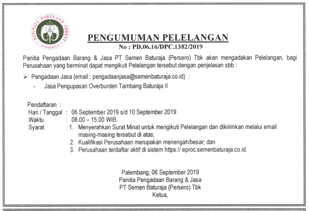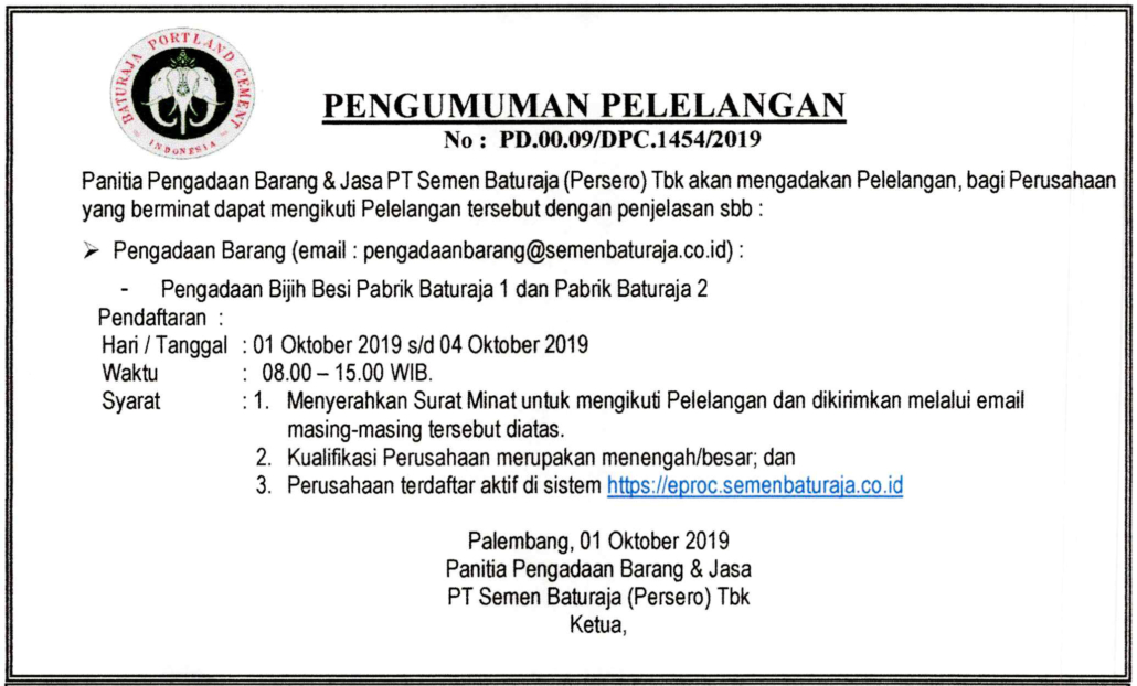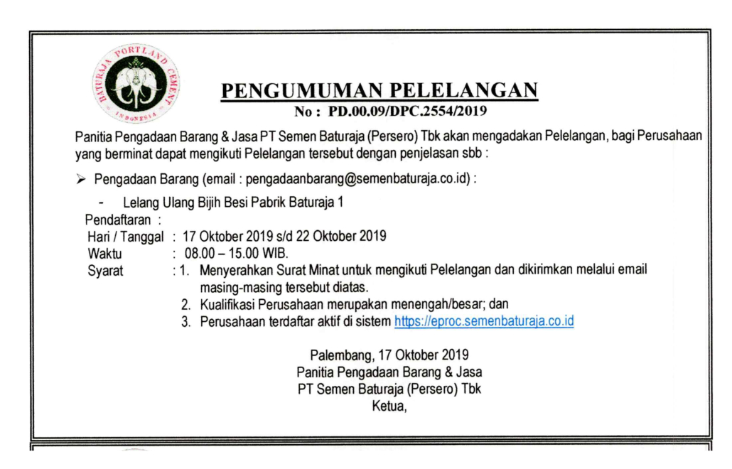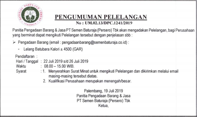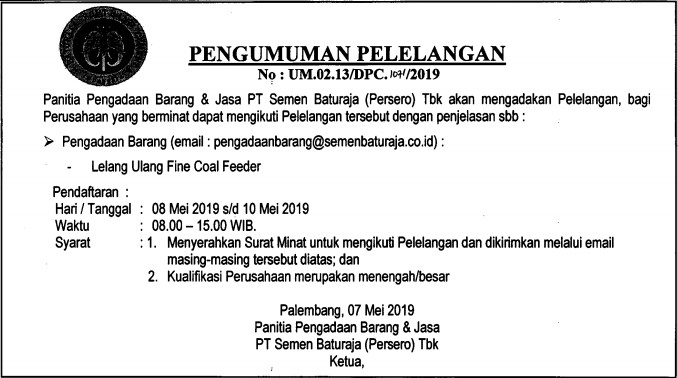Panitia Pengadaan Barang PT Semen Baturaja (Persero) Tbk akan mengadakan Pelelangan, bagi Perusahaan yang berminat dapat mengikuti Pelelangan tersebut dengan penjelasan sebagai berikut:
