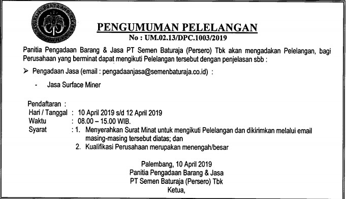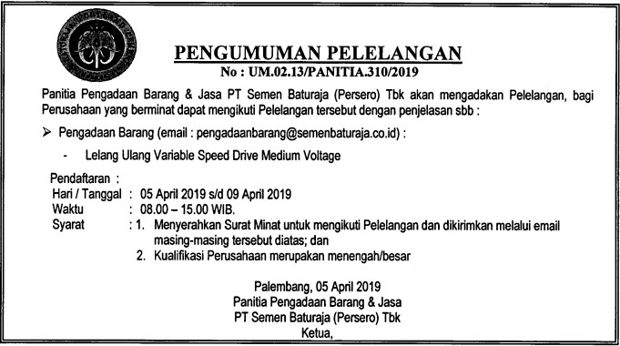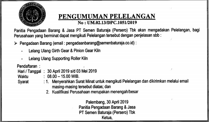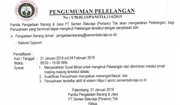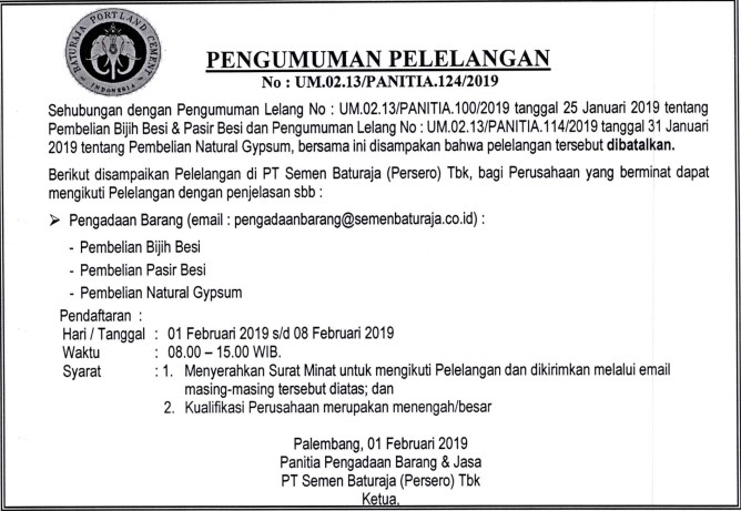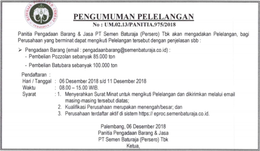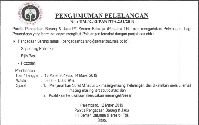 Panitia Pengadaan Barang PT Semen Baturaja (Persero) Tbk akan mengadakan Pelelangan, bagi Perusahaan yang berminat dapat mengikuti Pelelangan tersebut dengan penjelasan sebagai berikut: