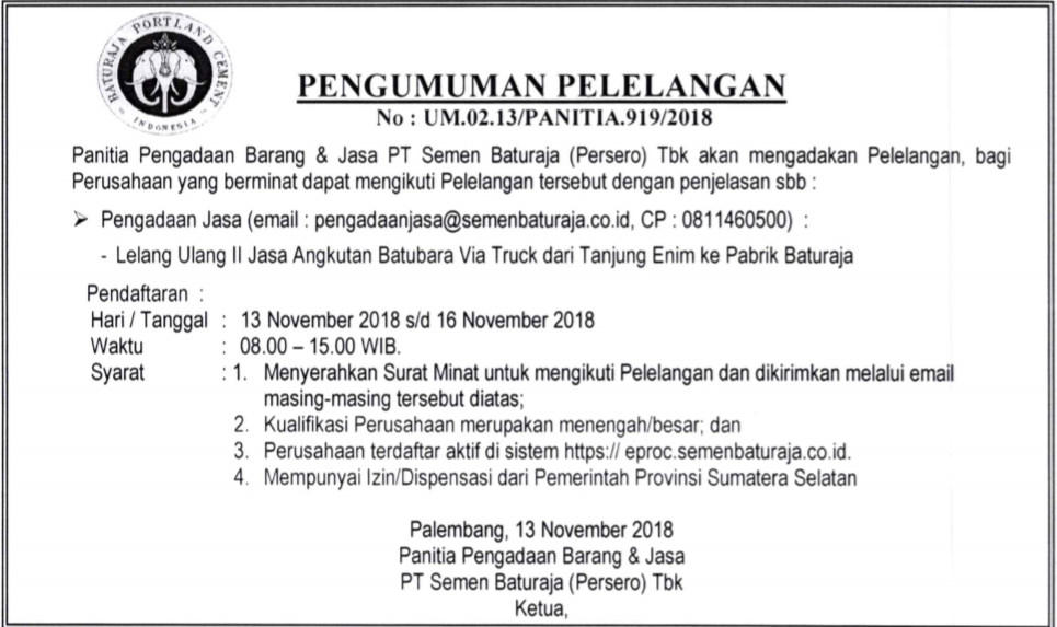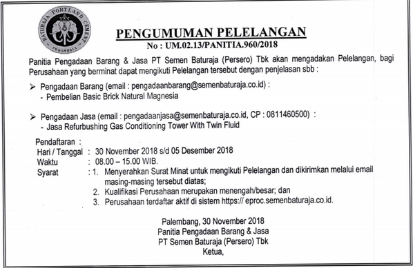 Panitia Pengadaan Barang PT Semen Baturaja (Persero) Tbk akan mengadakan Pelelangan, bagi Perusahaan yang berminat dapat mengikuti Pelelangan tersebut dengan penjelasan sebagai berikut
