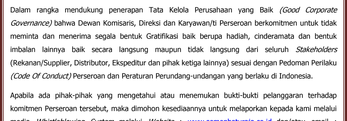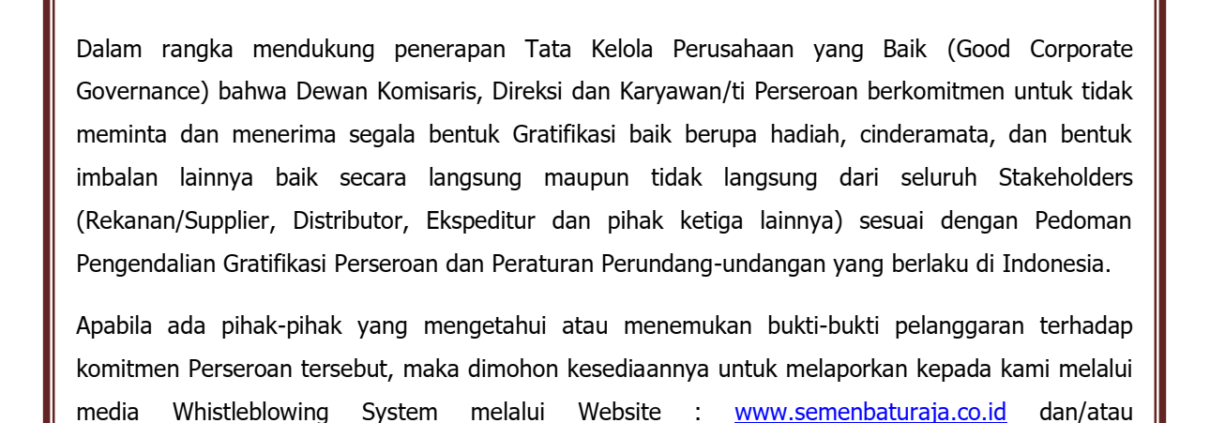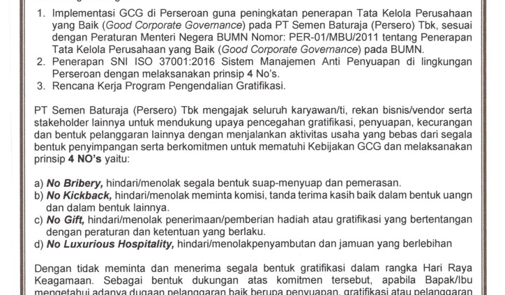 Penerapan ISO 37001:2016 ini juga memberikan panduan bagi Perusahaan untuk mengimplementasikan dan terus meningkatkan program kepatuhan dengan tujuan untuk mengidentifikasi, mencegah dan mendeteksi penyuapan. Hal ini akan berdampak pada proses bisnis Semen Baturaja menjadi lebih transparan.{}