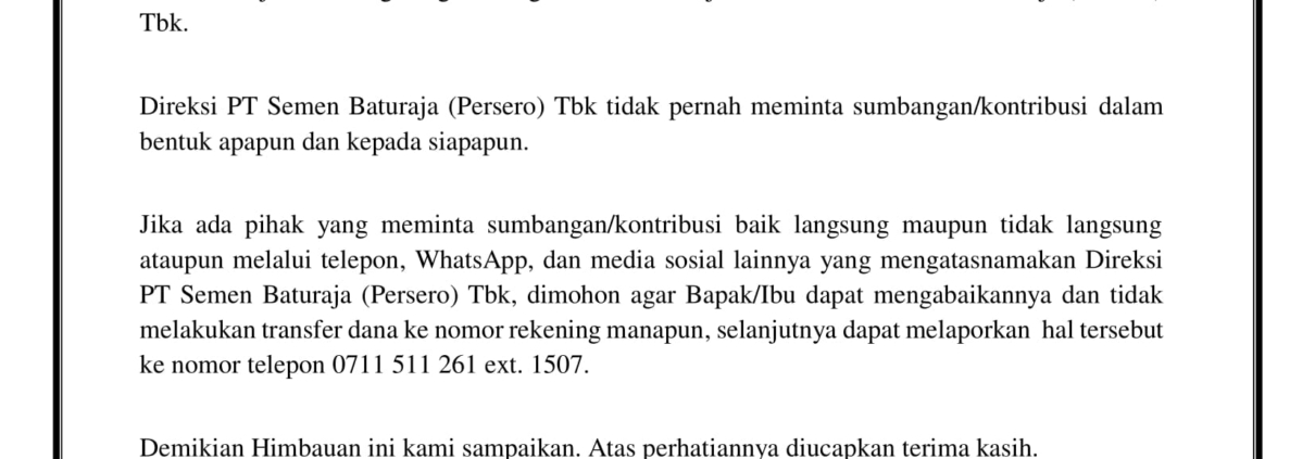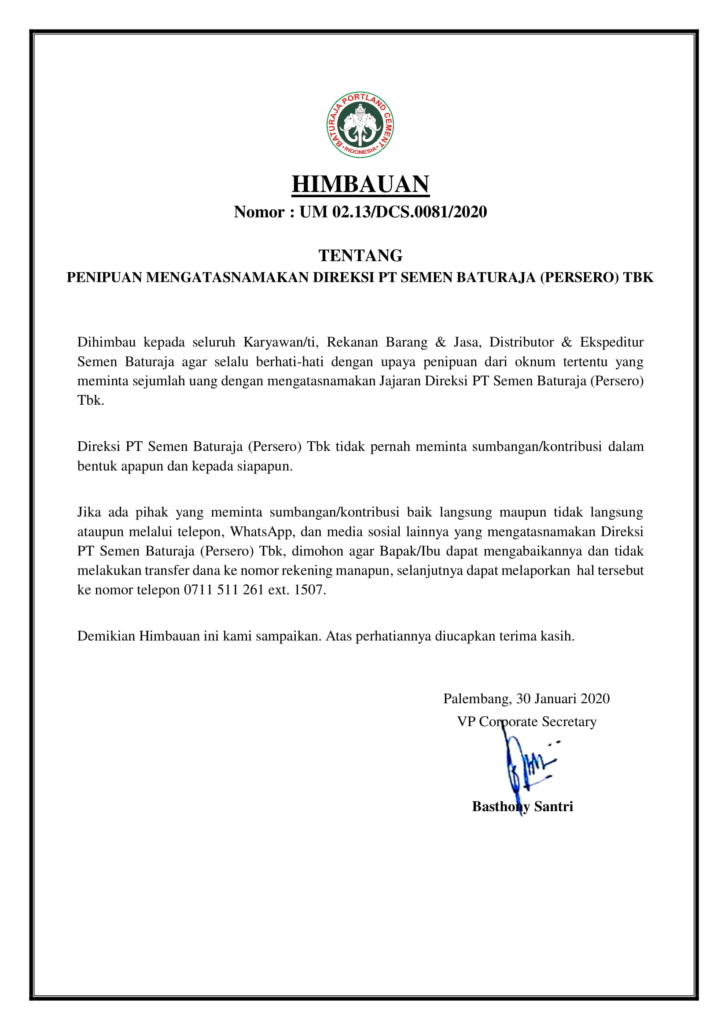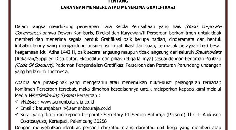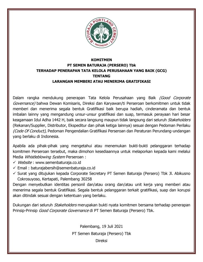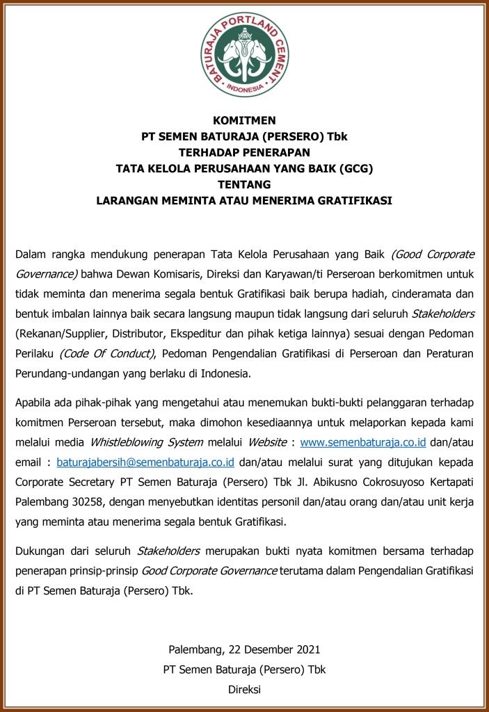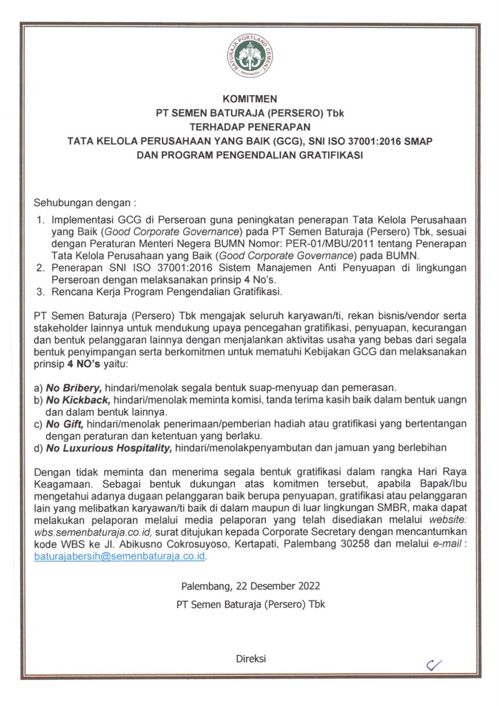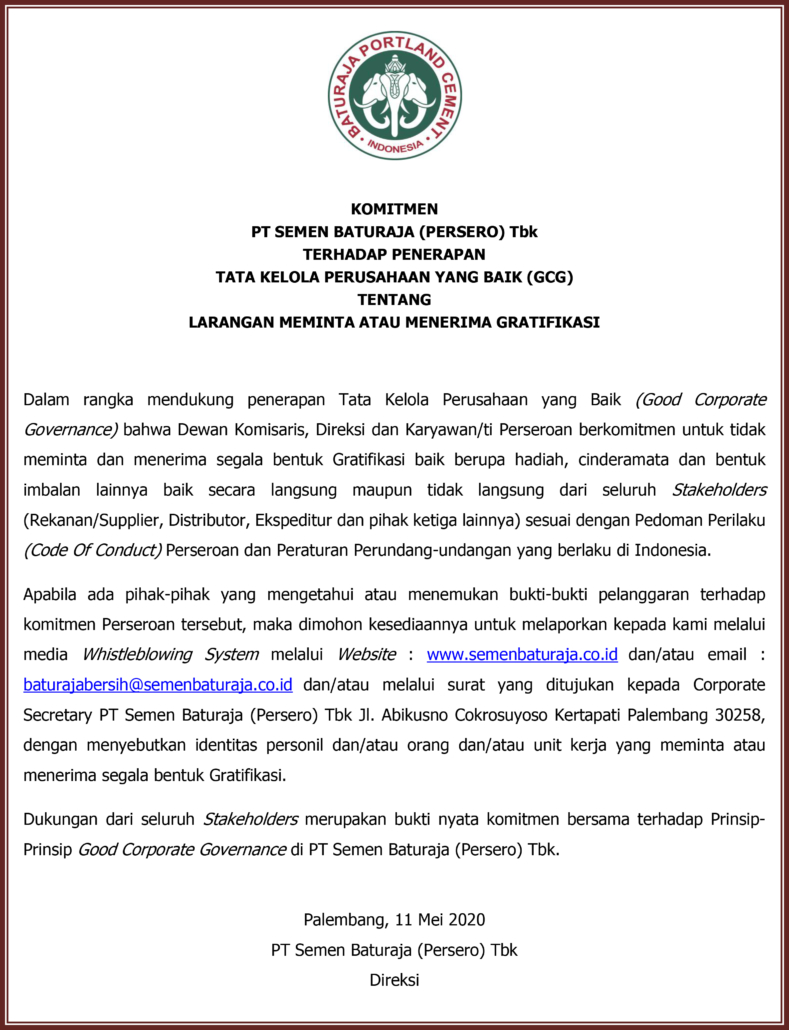PALEMBANG – PT Semen Baturaja (Persero) Tbk terus berkomitmen secara konsisten untuk mencegah segala bentuk penyuapan di lingkungan perusahaan dan terus berupaya menjadi perusahaan publik yang menjalankan Good Corporate Governance (GCG). Hal tersebut diwujudkan melalui Sertifikat ISO 37001:2016 tentang Sistem Manajemen Anti Penyuapan (SMAP) yang diperoleh perusahaan pada 11 Desember 2020 lalu.