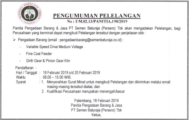 The committee procurement of Goods & Services PT Semen Baturaja (Persero) Tbk will held the auctions, for the company that are interested can be follow the auction with an explanation as follows:
