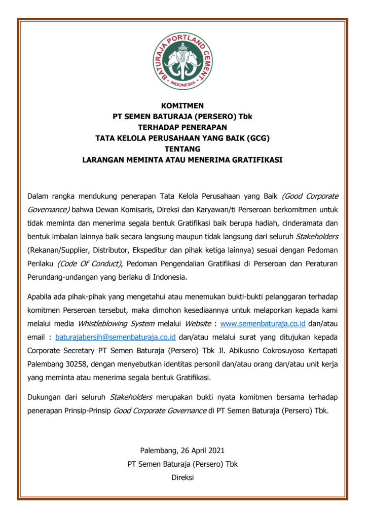 https://semenbaturaja.co.id/wp-content/uploads/2021/04/Komitmen-SMBR-Tentang-Gratifikasi-Tahun-2021.jpg20481448Admin SMBRhttps://semenbaturaja.co.id/wp-content/uploads/2026/01/LOGO-SMBR-BARU-Persero.pngAdmin SMBR2021-04-26 15:23:332021-04-28 15:25:12PT Semen Baturaja (Persero) Tbk’s Commitment to the Implementation of Good Corporate Governance (GCG) Regarding the Prohibition of Requesting or Receiving Gratuities in 2021