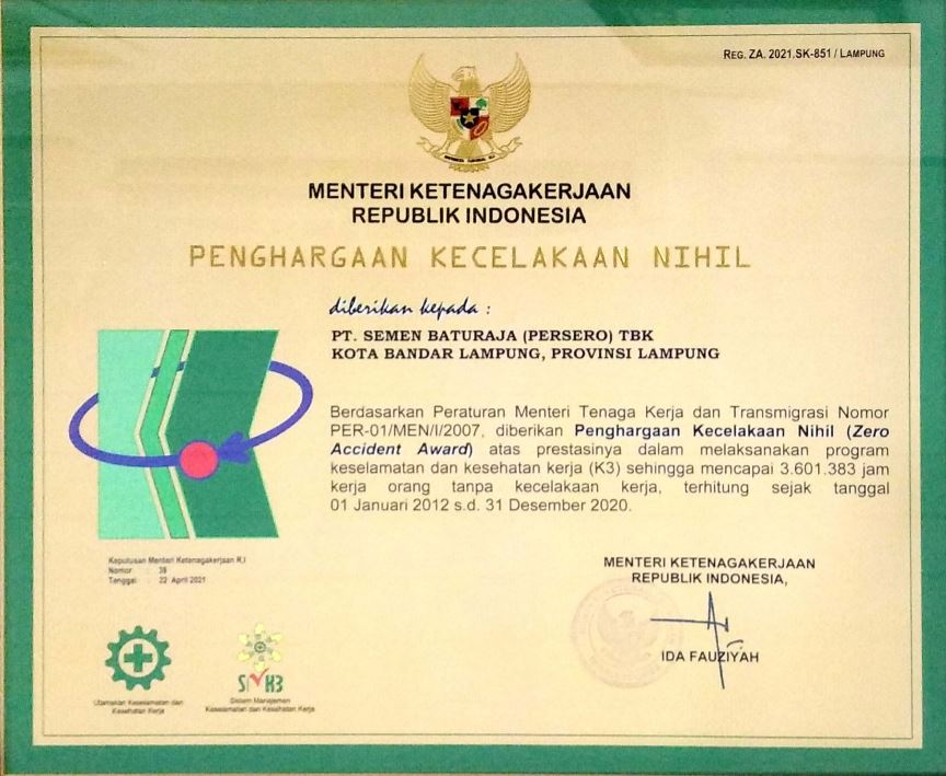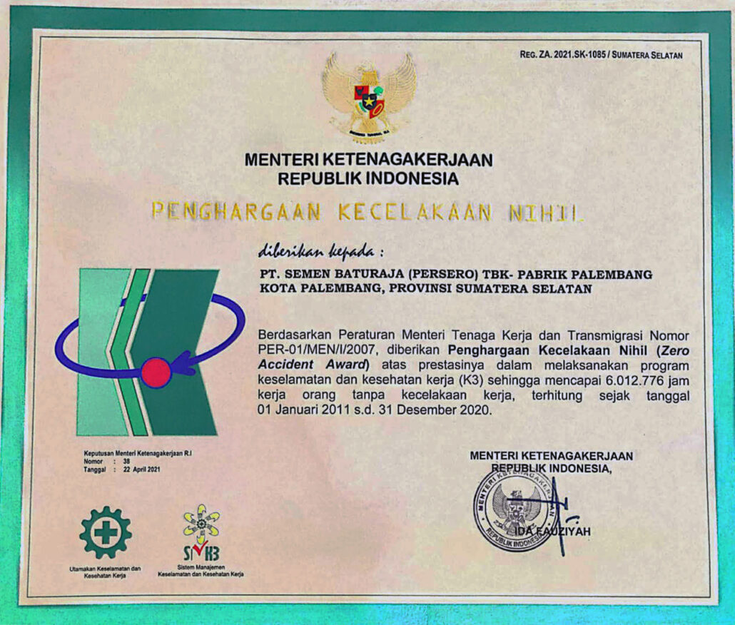 JAKARTA – Semen Baturaja has again claimed the Zero Accident award during K3 2021