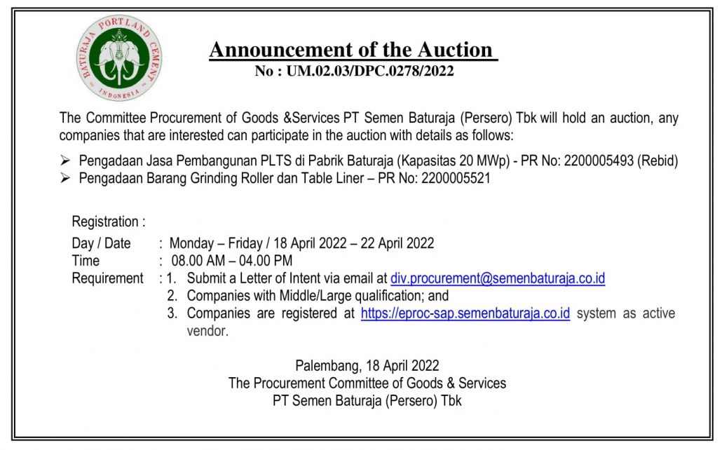 The committee procurement of Goods & Services PT Semen Baturaja Tbk will held the auctions, for the company that are interested can be follow the auction with an explanation as follows: