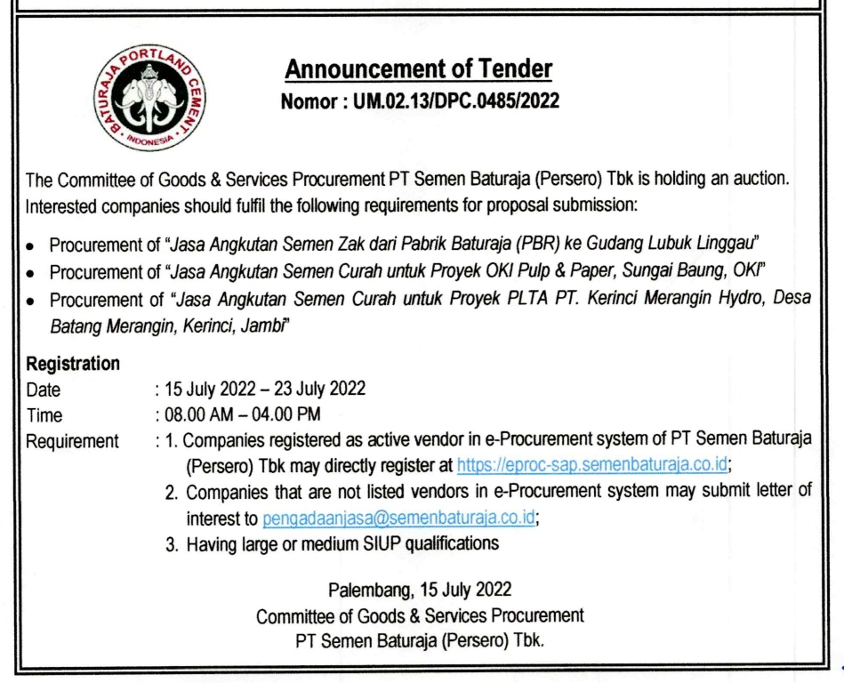 The committee procurement of Goods & Services PT Semen Baturaja (Persero) Tbk will held the auctions, for the company that are interested can be follow the auction with an explanation as follows:
