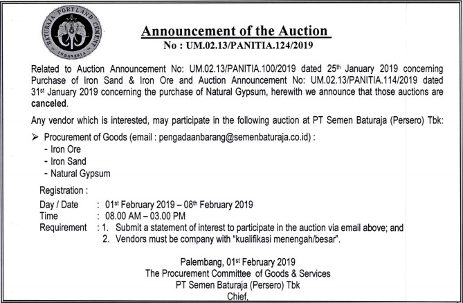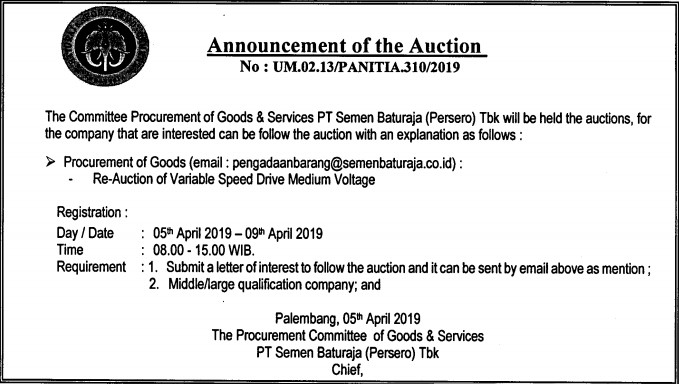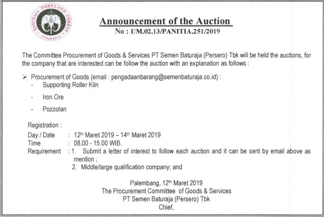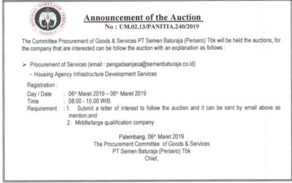 The committee procurement of Goods & Services PT Semen Baturaja (Persero) Tbk will held the auctions, for the company that are interested can be follow the auction with an explanation as follows: