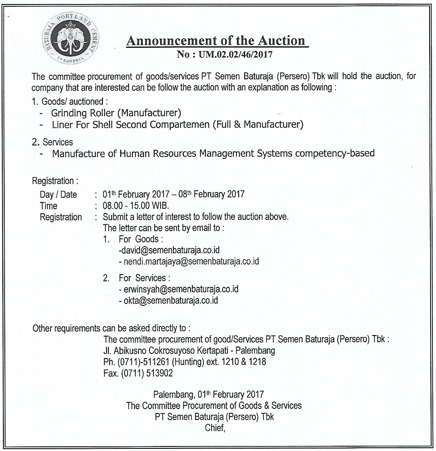The committee procurement of Goods & Services PT Semen Baturaja (Persero) Tbk will held the auctions, for the company that are interested can be follow the auction with an explanation as follows :