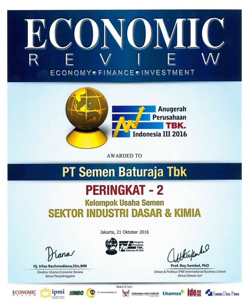 Jakarta, October 21, 2016, at the Mawar 1 Ballroom, Balai Kartini has lasted The Best Listed Company Awards 2016. This event was held by the Economic Review magazine and IPMI (International Business School). PT Semen Baturaja (Persero) Tbk gained 2nd place for groups of Cement Business, Basic Industry & Chemical Sector. This award was received by the CEO Mr. Pamudji Rahardjo and accompanied by the Director of Finance Mr. Ageng Purboyo Angrenggono.