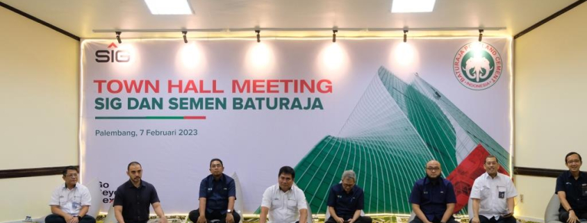 PALEMBANG – After integration, PT Semen Indonesia (Persero) Tbk (SIG) and PT Semen Baturaja Tbk (SMBR) held a Town Hall Meeting which took place at the SMBR Head Office in Palembang City in a hybrid manner on Tuesday (7/2). Present at the occasion were the SIG Board of Directors, including SIG Supply Chain Director Adi Munandir, Production Director Yosviandri, Business and Marketing Director Aulia Mulki Oemar, and HR and General Affairs Director Agung Wiharto.