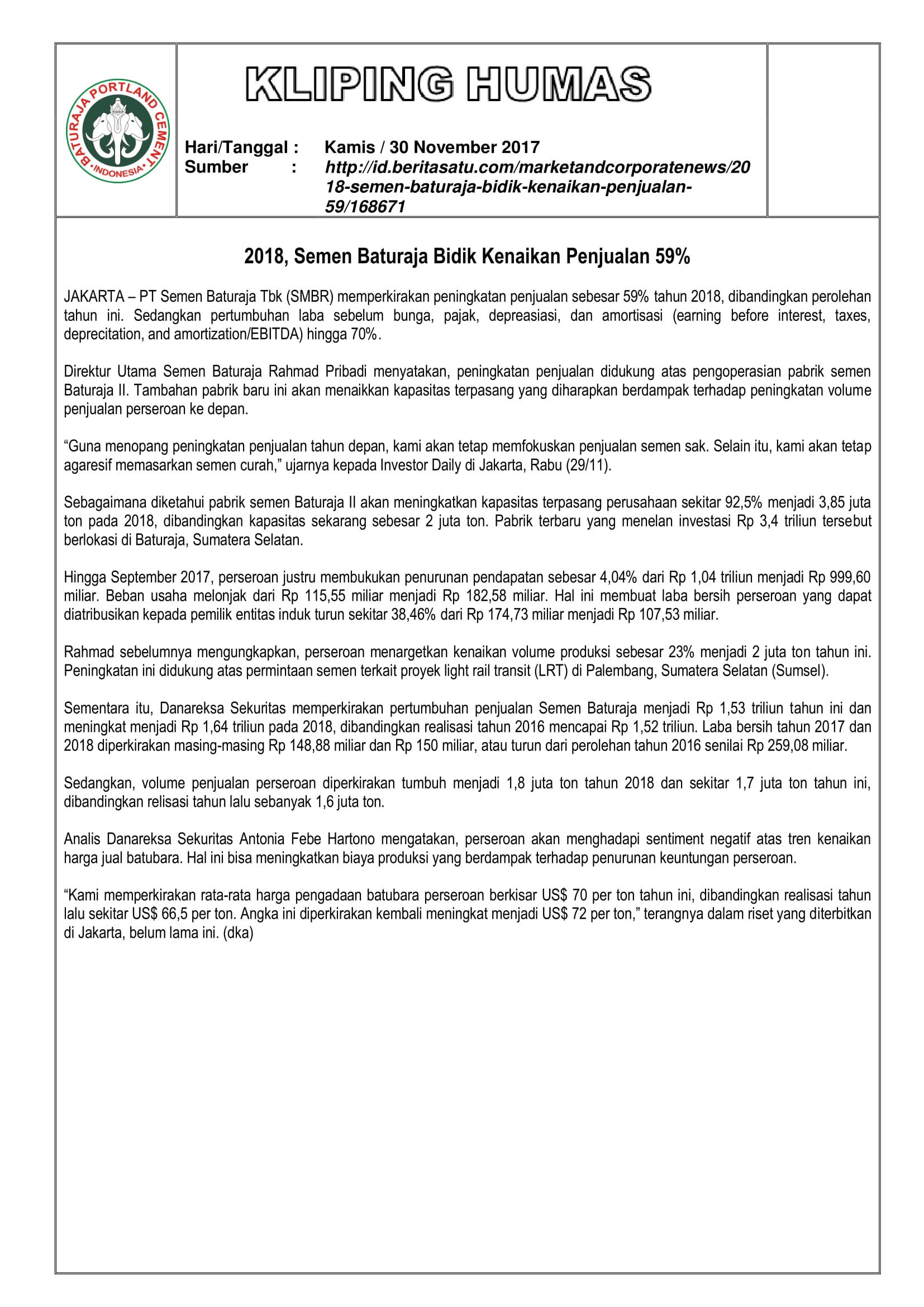 Kliping Media : 2018, Semen Baturaja Bidik Kenaikan Penjualan 59%