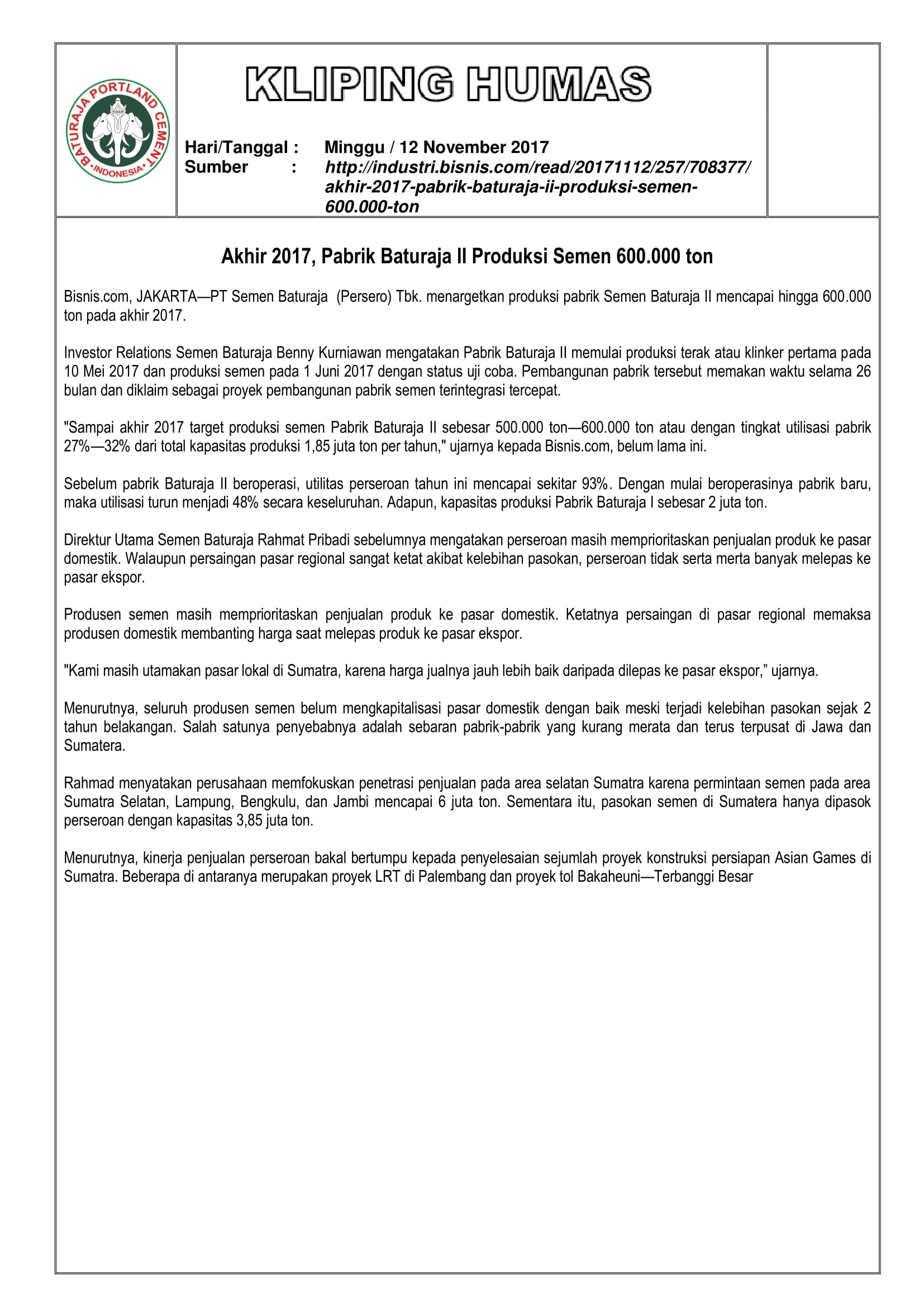 Kliping Media : Akhir 2017, Pabrik Baturaja II Produksi Semen 600,000 ton