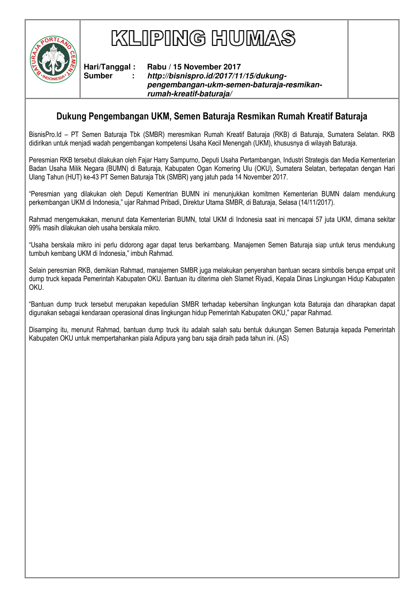 Kliping Media : Dukung Pengembangan UKM, Semen Baturaja Resmikan Rumah Kreatif Baturaja