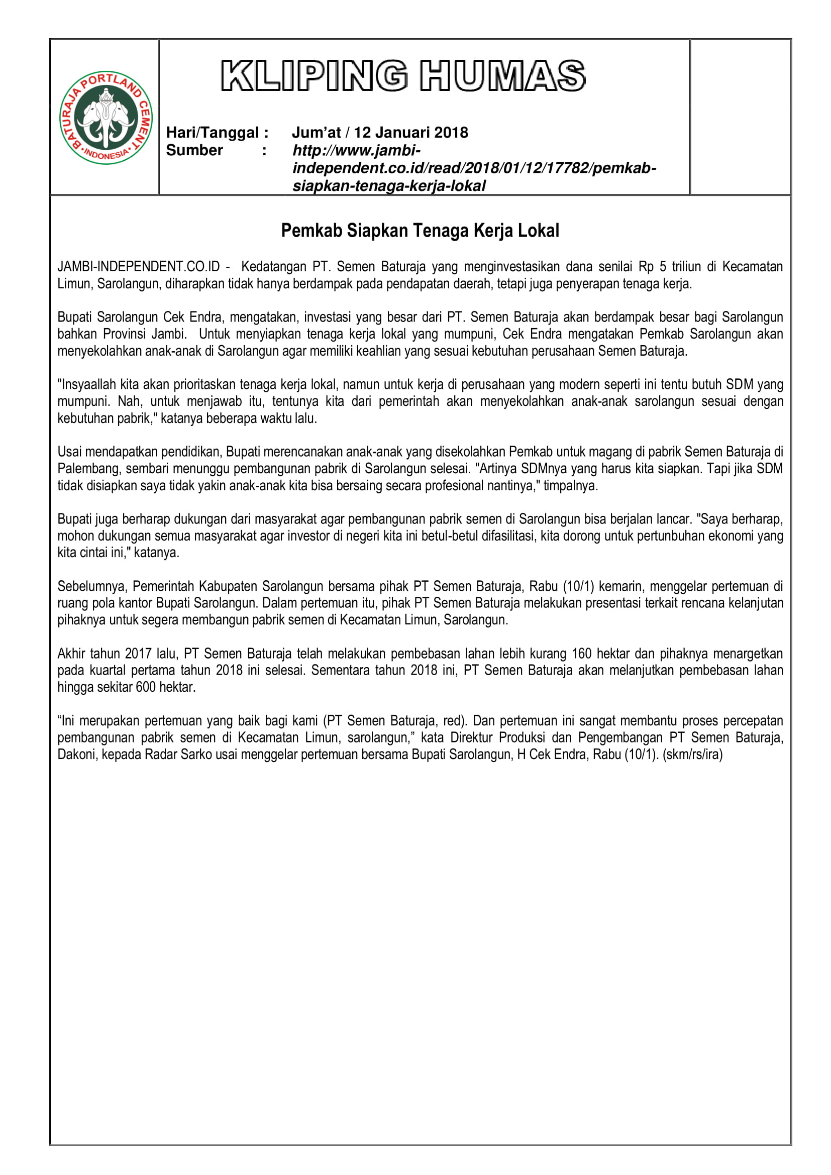 Kliping Media : Pemerintah Kabupaten Siapkan Tenaga Kerja Lokal