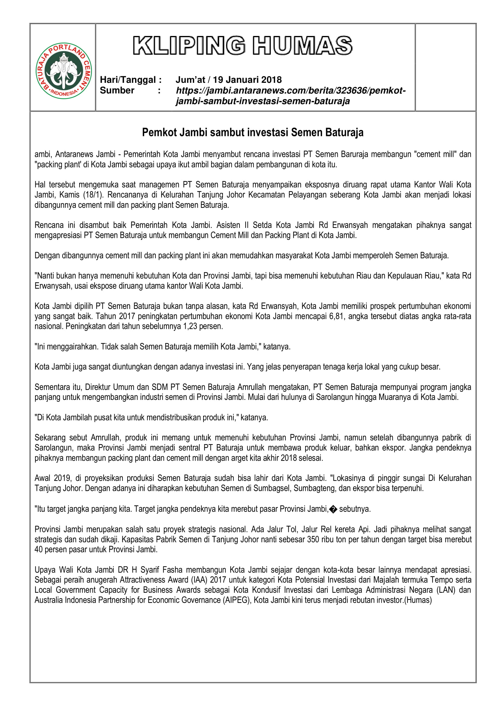 Kliping Media : Pemerintah Kota Jambi Sambut Investasi Semen Baturaja