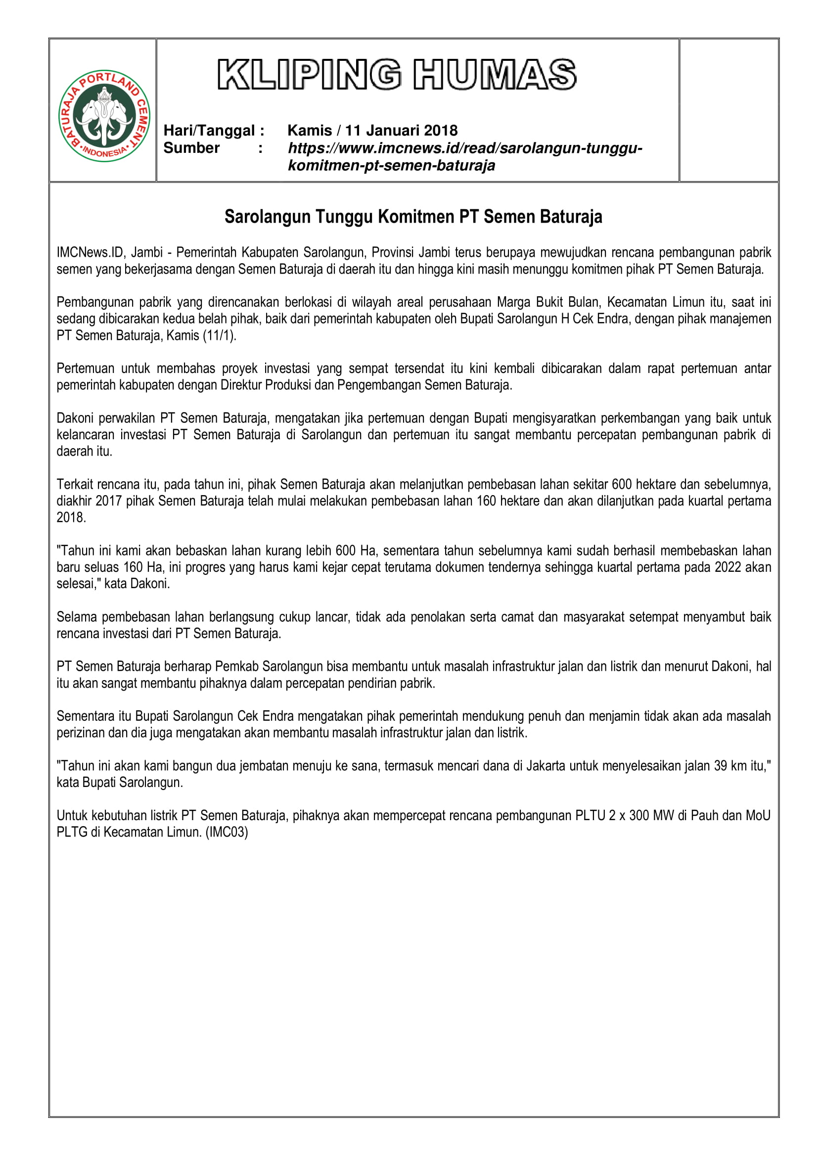 Kliping Media : Sarolangun Tunggu Komitmen PT Semen Baturaja