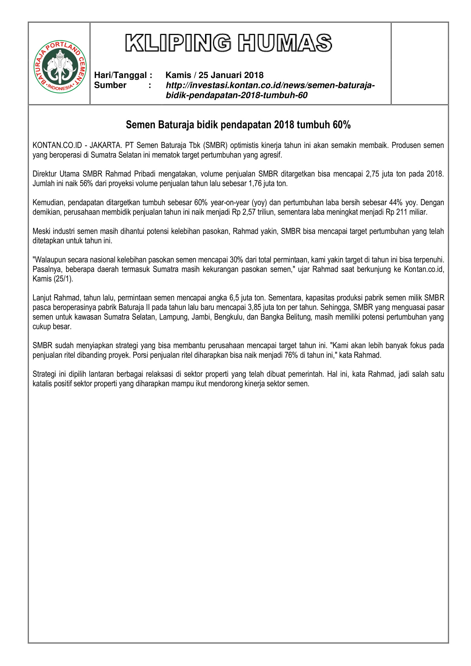 Kliping Media : Semen Baturaja Bidik Pendapatan 2018 Tumbuh 60%