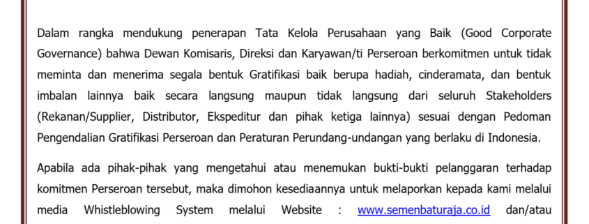 https://semenbaturaja.co.id/wp-content/uploads/2019/12/image.png16691290Admin SMBRhttps://semenbaturaja.co.id/wp-content/uploads/2026/01/LOGO-SMBR-BARU-Persero.pngAdmin SMBR2019-12-20 14:51:122019-12-20 14:54:49Komitmen PT Semen Baturaja (Persero) Tbk Terhadap Penerapan Tata Kelola Perusahaan Yang Baik (GCG) Tentang Larangan Meminta Atau Menerima Gratifikasi Tahun 2019