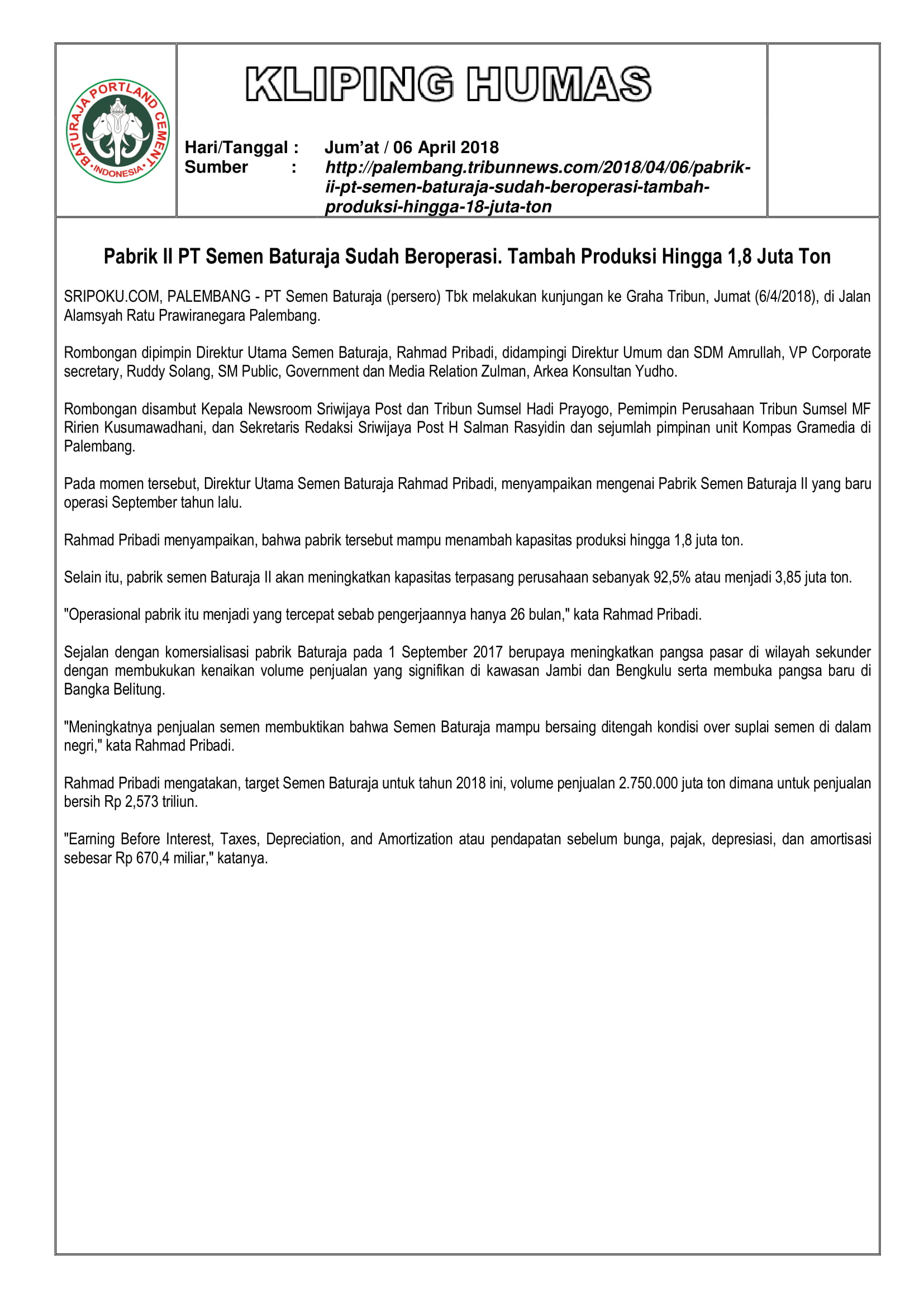PABRIK II PT SEMEN BATURAJA SUDAH BEROPERASI, TAMBAH PRODUKSI HINGGA 1,8 JUTA TON