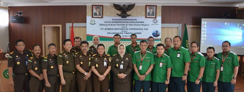 JAMBI – PT Semen Baturaja (Persero) Tbk dan Kejaksaan Tinggi Jambi menandatangani nota kesepakatan kerjasama di Bidang Hukum Perdata dan Tata Usaha Negara di Kantor Kejaksaan Tinggi Jambi pada hari Rabu (18/04). Direktur Utama PT Semen Baturaja (Persero) Tbk, Rahmad Pribadi bersama dengan jajaran direksi lainnya hadir pada acara tersebut. Begitu pula dengan Kepala Kejaksaan Tinggi Jambi, Nurwinah beserta jajaran yang juga turut hadir pada acara tersebut. Nota kesepakatan kerjasama antara PT Semen Baturaja (Persero) Tbk dan Kejaksaan Tinggi Jambi ini berupa kerjasama dalam bentuk penyelesaian masalah hukum di Bidang Perdata & Tata Usaha Negara yang ruang lingkupnya adalah pemberian bantuan hukum; pemberian pertimbangan hukum; serta tindakan hukum lainnya yang diperlukan oleh PT Semen Baturaja (Persero) Tbk. Direktur Utama PT Semen Baturaja (persero) Tbk, Rahmad Pribadi menegaskan, Nota kesepakatan kerjasama dengan Kejaksaan Tinggi Jambi yang ditandatangani tersebut menjadi sangat penting untuk menjaga Perseroan sebagai salah satu aset negara dan objek vital nasional.