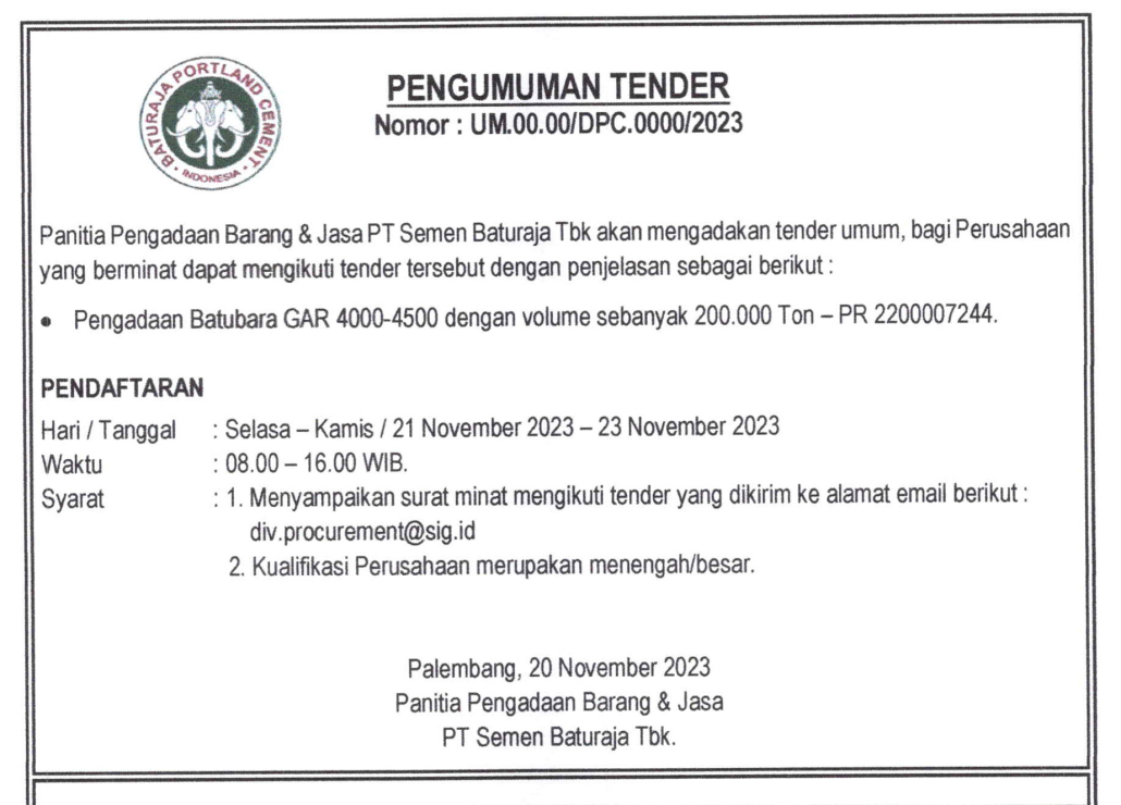 Panitia Pengadaan Barang PT Semen Baturaja Tbk akan mengadakan Pelelangan, bagi Perusahaan yang berminat dapat mengikuti Pelelangan tersebut dengan penjelasan sebagai berikut: