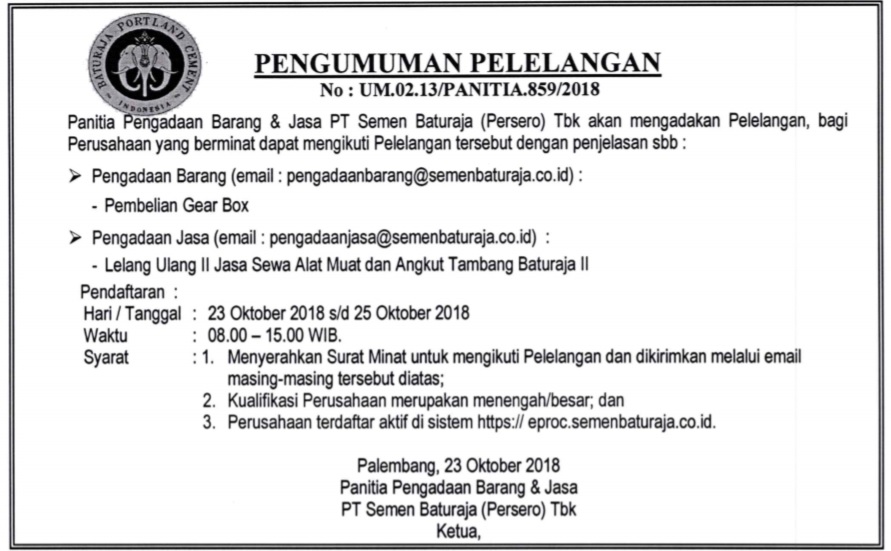 Panitia Pengadaan Barang PT Semen Baturaja (Persero) Tbk akan mengadakan Pelelangan, bagi Perusahaan yang berminat dapat mengikuti Pelelangan tersebut dengan penjelasan sebagai berikut