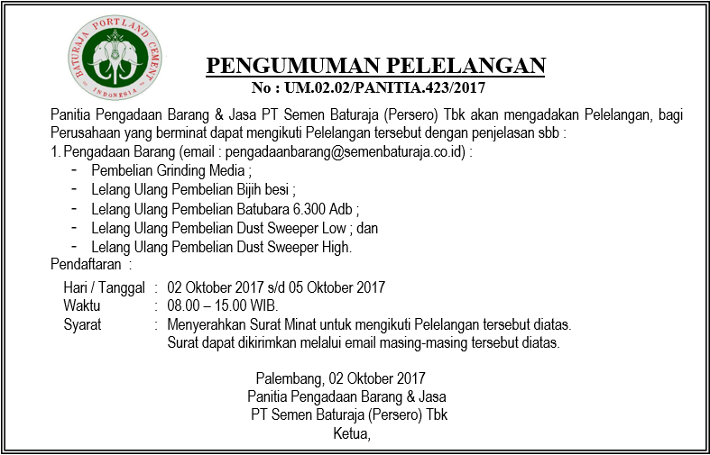 Panitia Pengadaan Barang PT Semen Baturaja (Persero) Tbk akan mengadakan Pelelangan, bagi Perusahaan yang berminat dapat mengikuti Pelelangan tersebut dengan penjelasan sebagai berikut :