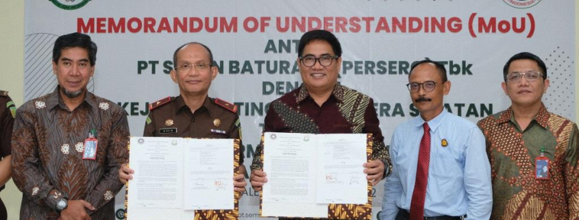 PALEMBANG – PT Semen Baturaja (Persero) Tbk (SMBR) Menandatangani Kerjasama (MoU) dengan Kejaksaan Tinggi (Kejati) Sumatera Selatan tentang Penanganan Permasalahan Hukum Perdata dan Tata Usaha Negara di Kantor Pusat SMBR, Palembang pada Kamis (16/06).