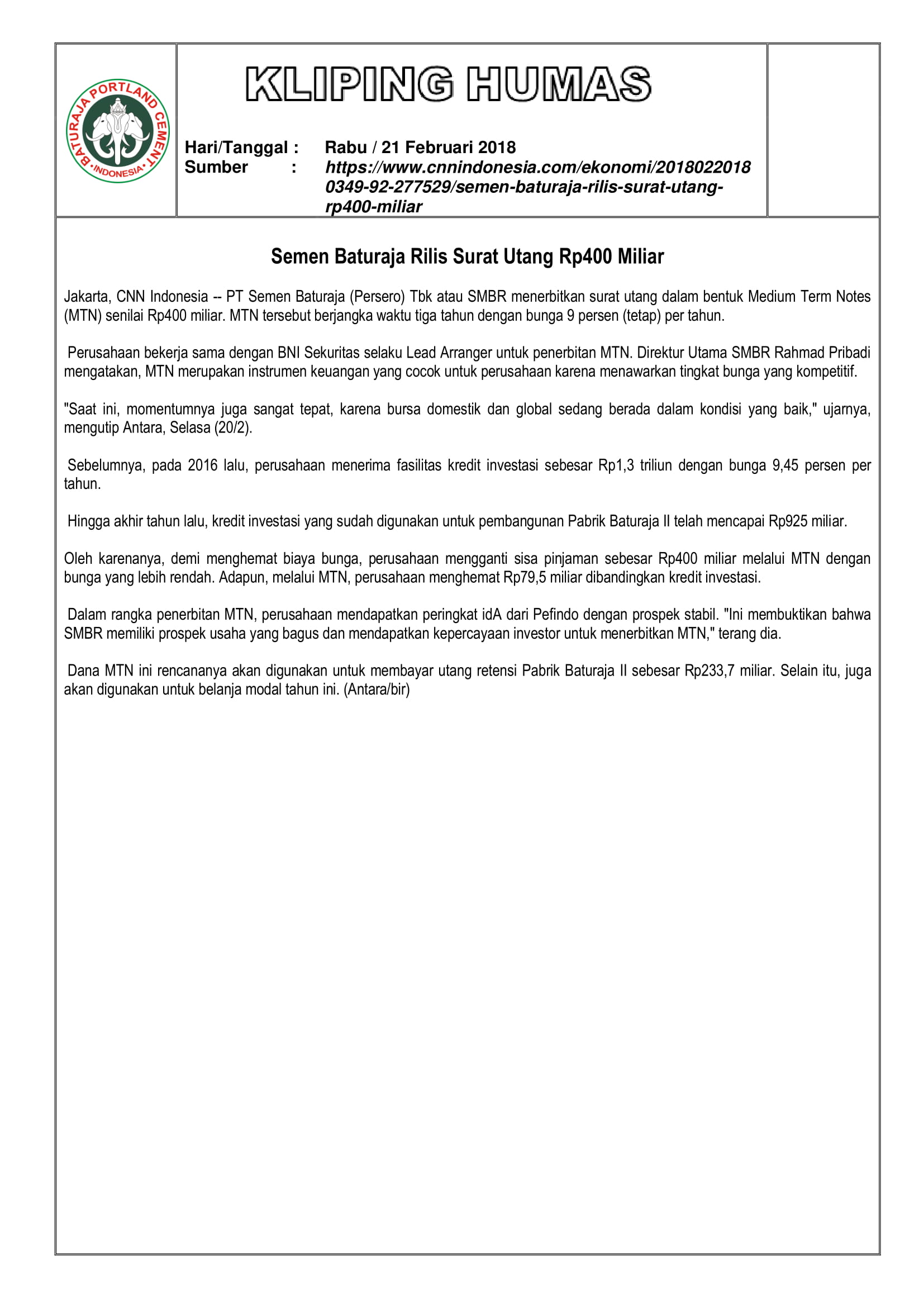 SEMEN BATURAJA RILIS SURAT UTANG RP400 MILIAR