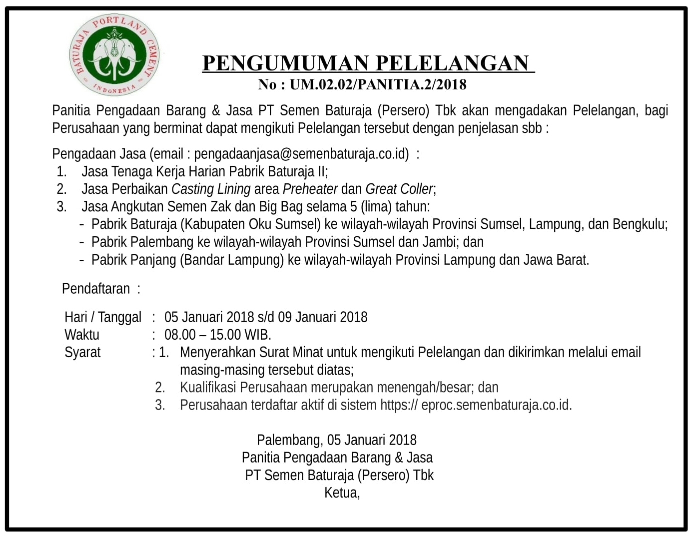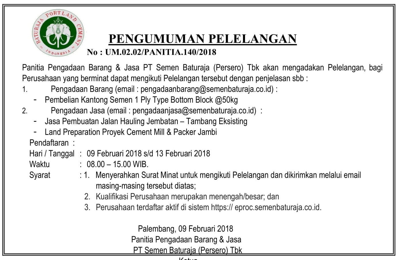 Panitia Pengadaan Barang PT Semen Baturaja (Persero) Tbk akan mengadakan Pelelangan, bagi Perusahaan yang berminat dapat mengikuti Pelelangan tersebut dengan penjelasan sebagai berikut :