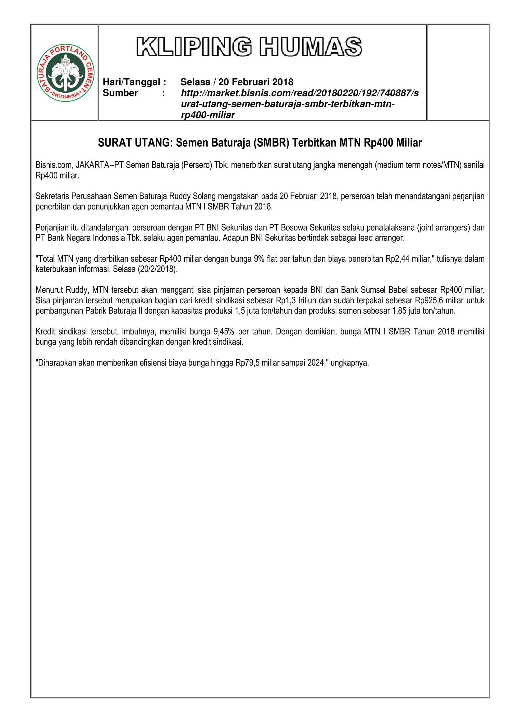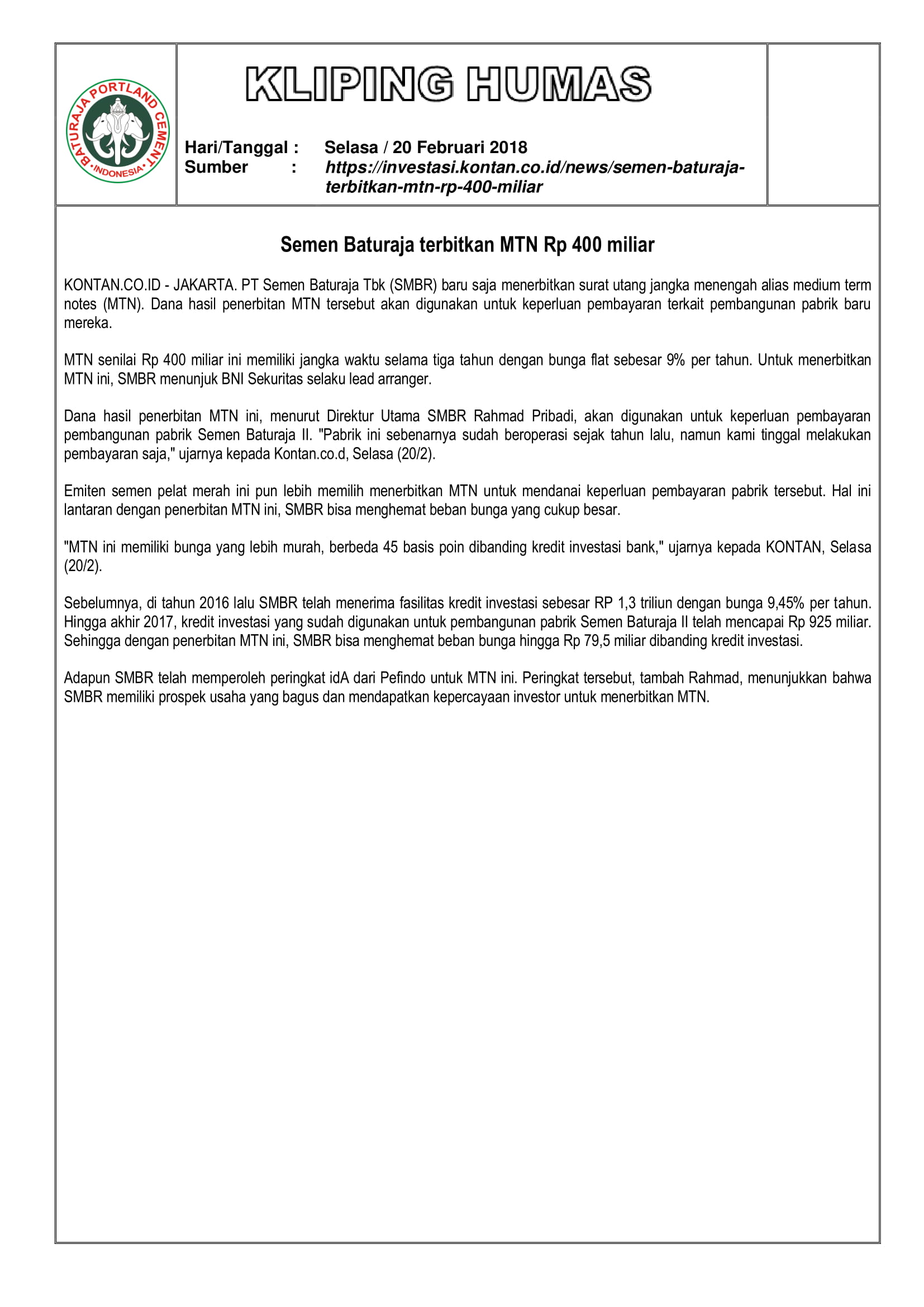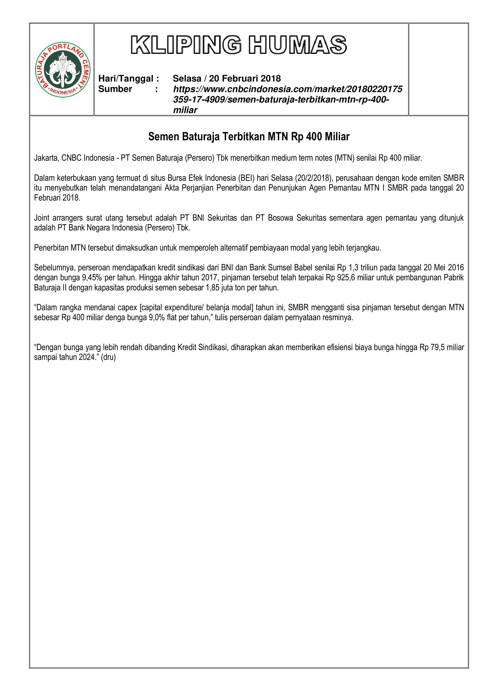 Dalam rangka penerbitan MTN ini, Perseroan mendapat peringkat idA dari PEFINDO dengan outlook stabil, “Ini membuktikan bahwa SMBR memiliki prospek usaha yang bagus dan mendapatkan kepercayaan investor untuk menerbitkan MTN” kata Rahmad. Dana MTN rencananya akan digunakan Perseroan untuk membayar utang retensi Pabrik Baturaja II sebesar Rp233,7 miliar. Selain itu juga akan digunakan sebagai salah satu alternatif pendanaan capex pada tahun 2018 ini seperti pembangunan cement mill & packing plant di Jambi. (Humas SMBR)