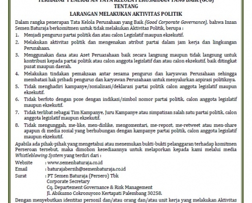 Laporkan perbuatan berindikasi pelanggaran yang terjadi di lingkungan PT Semen Baturaja (Persero) Tbk.