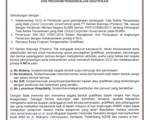 Laporkan perbuatan berindikasi pelanggaran yang terjadi di lingkungan PT Semen Baturaja (Persero) Tbk.