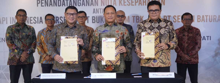 Penandatanganan MoU dilakukan oleh Rafli Yandra, Direktur Pengembangan Usaha PT Bukit Asam Tbk (PTBA); Rudi As Aturridha, Direktur Pengembangan Usaha & Kelembagaan PT Kereta Api Indonesia (Persero); Muhammad Syafitri, Direktur Operasi PT Semen Baturaja Tbk (SMBR) di Signature Lounge SIG, Jakarta, Selasa (22/10/2024).