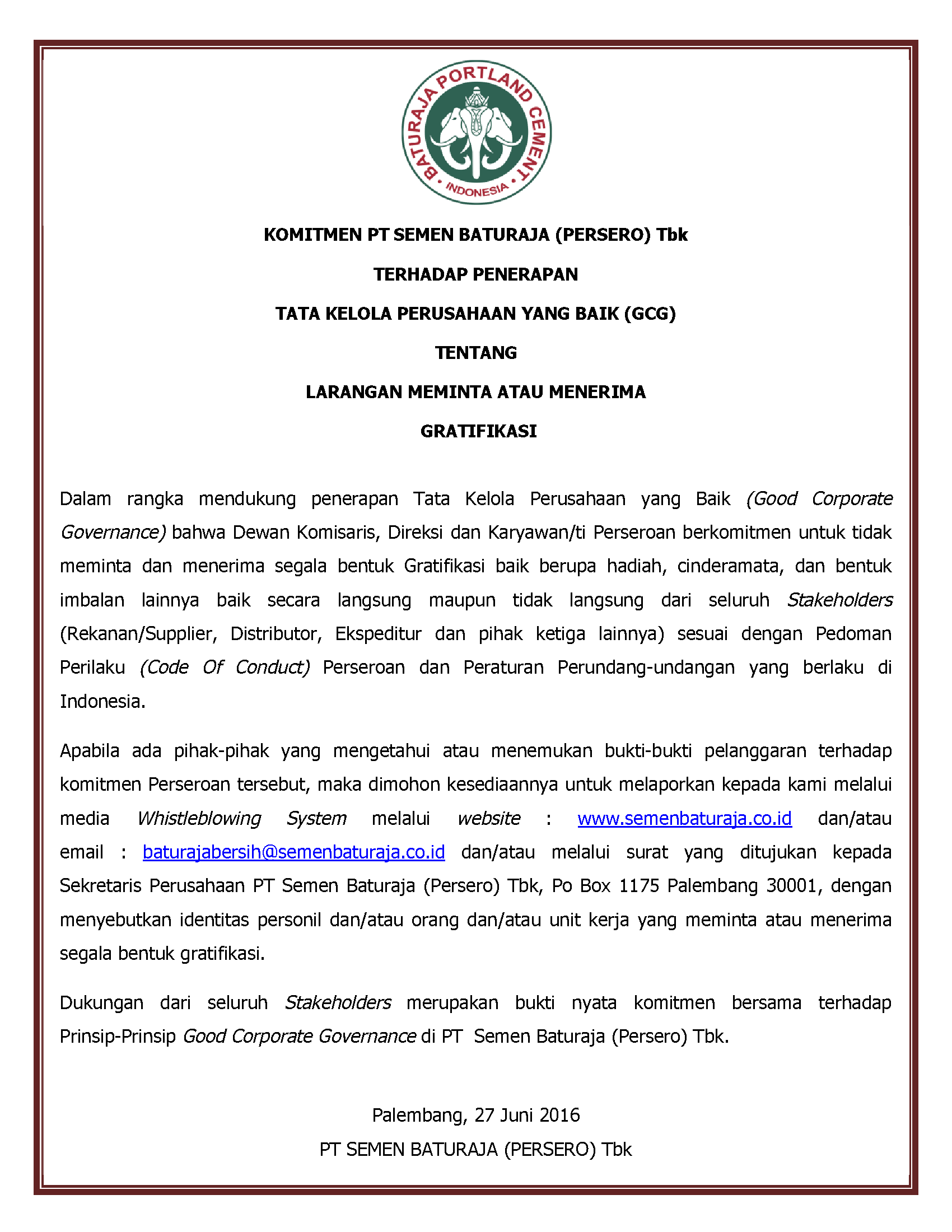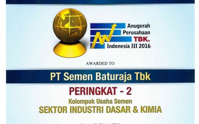 Pada kesempatan ini PT Semen Baturaja (Persero) Tbk mendapatkan penghargaan Good Corporate Governance 2016 dengan predikat sangat baik untuk kategori Industri dasar dan Kimia – Semen.