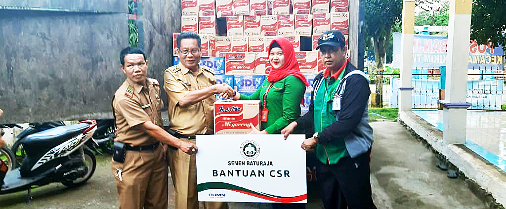 Bantuan sebanyak 250 dus air mineral dan 250 dus mie instan diserahkan oleh Tim CSR Semen Baturaja kepada Camat Kikim Bapak Pebroni.