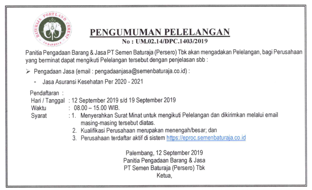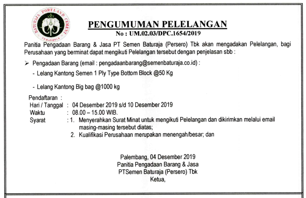 Panitia Pengadaan Barang PT Semen Baturaja (Persero) Tbk akan mengadakan Pelelangan, bagi Perusahaan yang berminat dapat mengikuti Pelelangan tersebut dengan penjelasan sebagai berikut: