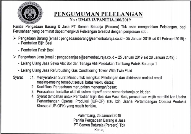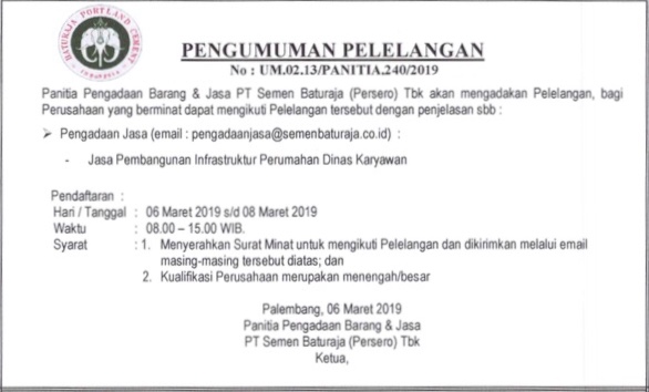 Panitia Pengadaan Barang PT Semen Baturaja (Persero) Tbk akan mengadakan Pelelangan, bagi Perusahaan yang berminat dapat mengikuti Pelelangan tersebut dengan penjelasan sebagai berikut:
