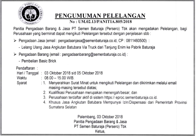 Panitia Pengadaan Barang PT Semen Baturaja (Persero) Tbk akan mengadakan Pelelangan, bagi Perusahaan yang berminat dapat mengikuti Pelelangan tersebut dengan penjelasan sebagai berikut