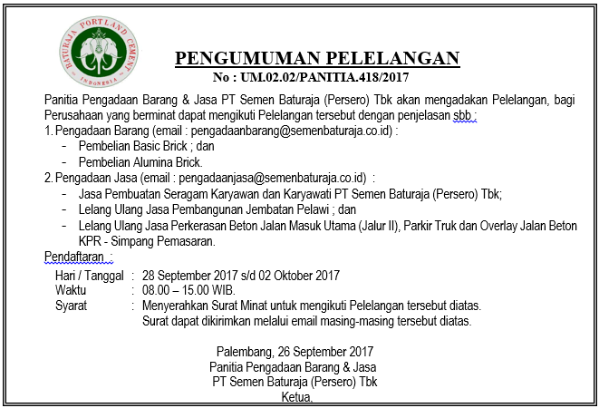 Panitia Pengadaan Barang PT Semen Baturaja (Persero) Tbk akan mengadakan Pelelangan, bagi Perusahaan yang berminat dapat mengikuti Pelelangan tersebut dengan penjelasan sebagai berikut :