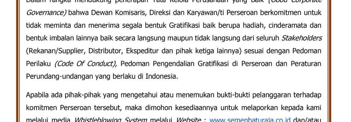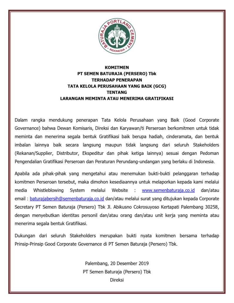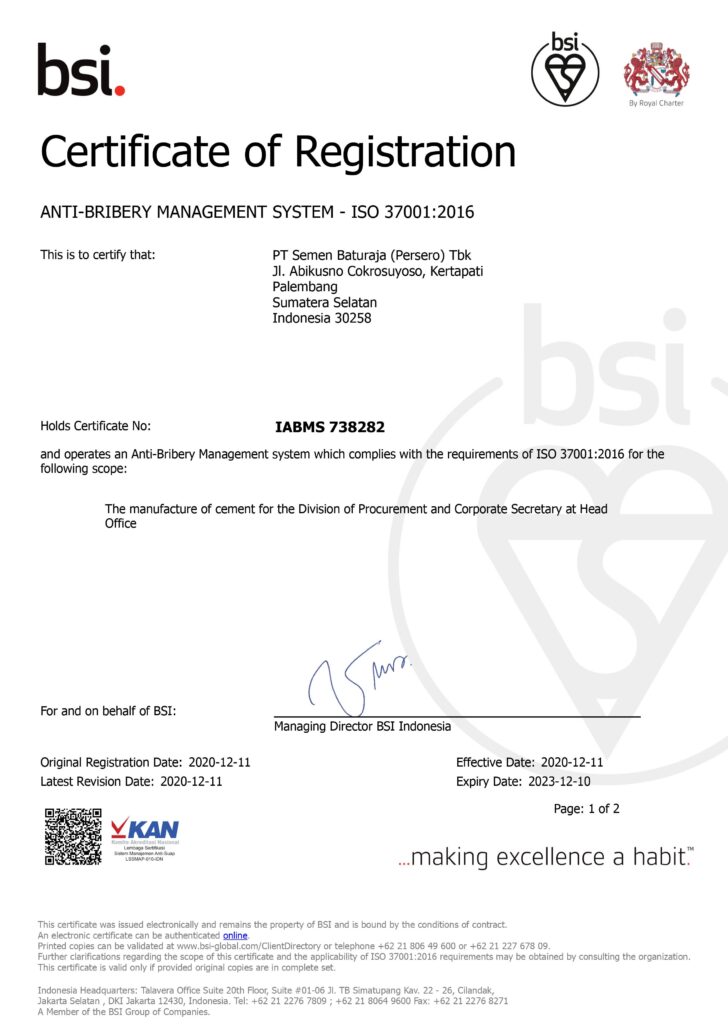 PALEMBANG – PT Semen Baturaja (Persero) Tbk terus berkomitmen secara konsisten untuk mencegah segala bentuk penyuapan di lingkungan perusahaan dan terus berupaya menjadi perusahaan publik yang menjalankan Good Corporate Governance (GCG). Hal tersebut diwujudkan melalui Sertifikat ISO 37001:2016 tentang Sistem Manajemen Anti Penyuapan (SMAP) yang diperoleh perusahaan pada 11 Desember 2020 lalu.