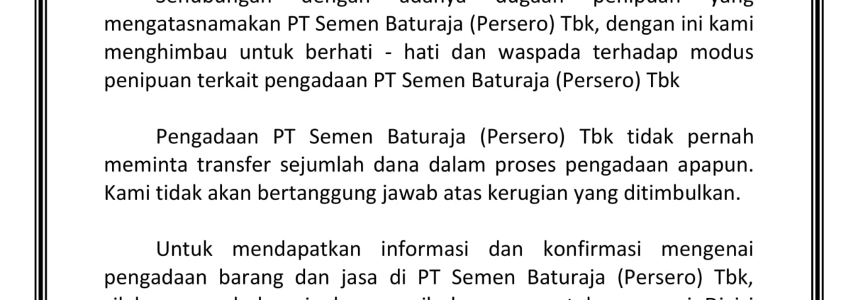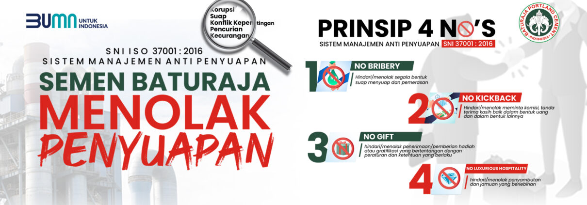 Penerapan ISO 37001:2016 ini juga memberikan panduan bagi Perusahaan untuk mengimplementasikan dan terus meningkatkan program kepatuhan dengan tujuan untuk mengidentifikasi, mencegah dan mendeteksi penyuapan. Hal ini akan berdampak pada proses bisnis Semen Baturaja menjadi lebih transparan.{}
