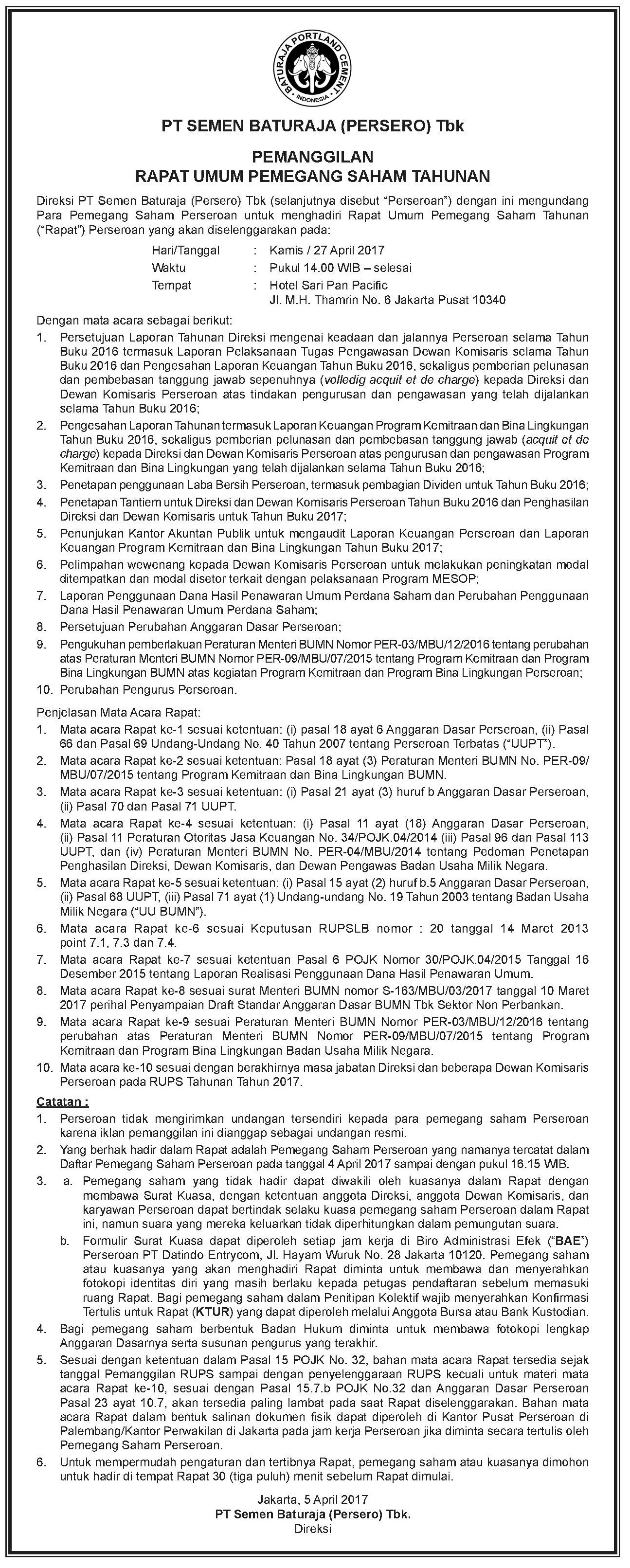 Sesuai dengan Peraturan Otoritas Jasa Keuangan No. 32/POJK.04/2014 tanggal 8 Desember 2014 tentang Rencana dan Penyelenggaraan Rapat Umum Pemegang Saham Perusahaan Terbuka (POJK No. 32) dan ketentuan Anggaran Dasar Perseroan maka Pemanggilan RUPST akan diumumkan melalui 1 (satu) surat kabar/harian berbahasa Indonesia yang berperedaran nasional, situs web Bursa Efek Indonesia dan situs web Perseroan www.semenbaturaja.co.id, pada tanggal 18 Maret 2016.