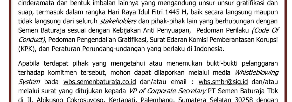BATURAJA – PT Semen Baturaja Tbk (SMBR) selaku anak usaha PT Semen Indonesia (Persero) Tbk (SIG) melakukan pelaksanaan overhaul terhadap Pabrik Baturaja II, Kabupaten Ogan Komering Ulu, Sumatera Selatan. Pelaksanaan overhaul pabrik tersebut, dilaksanakan selama 17 hari yang dimulai dari tanggal 22 Februari 2024.