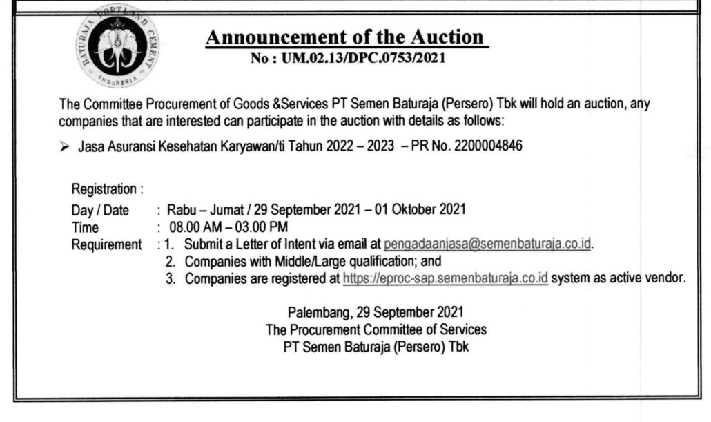 The committee procurement of Goods & Services PT Semen Baturaja (Persero) Tbk will held the auctions, for the company that are interested can be follow the auction with an explanation as follows: