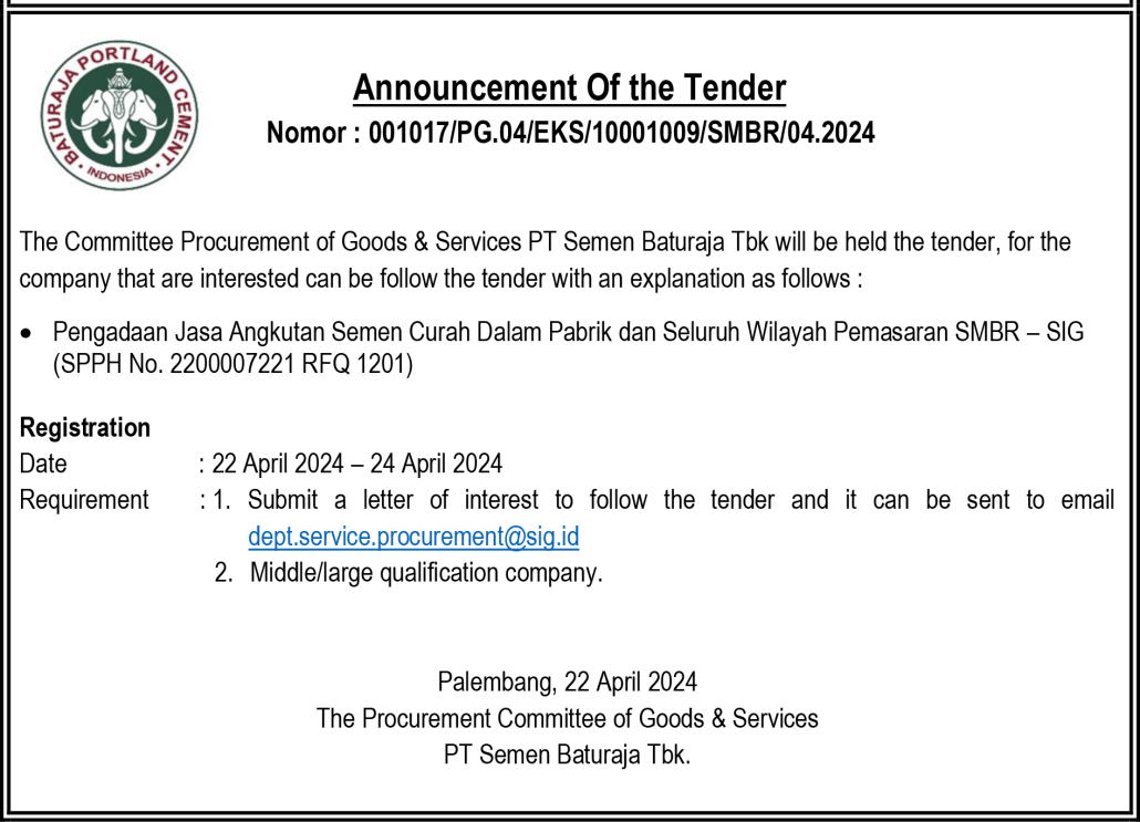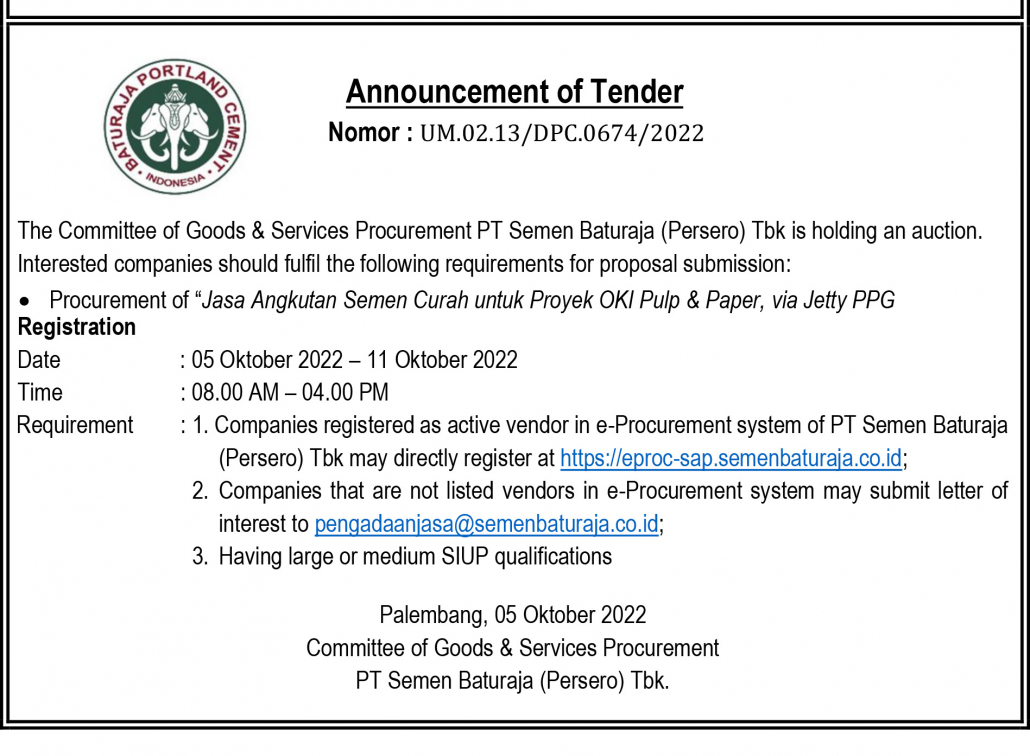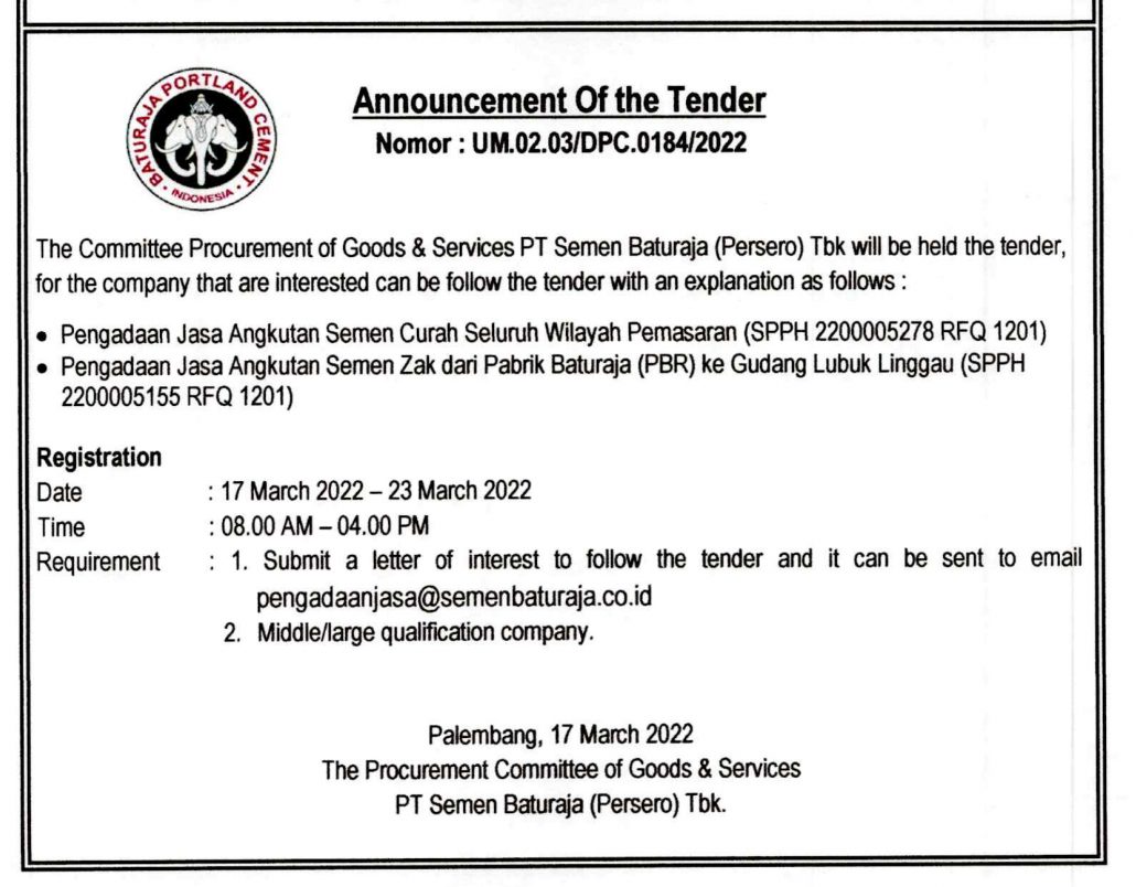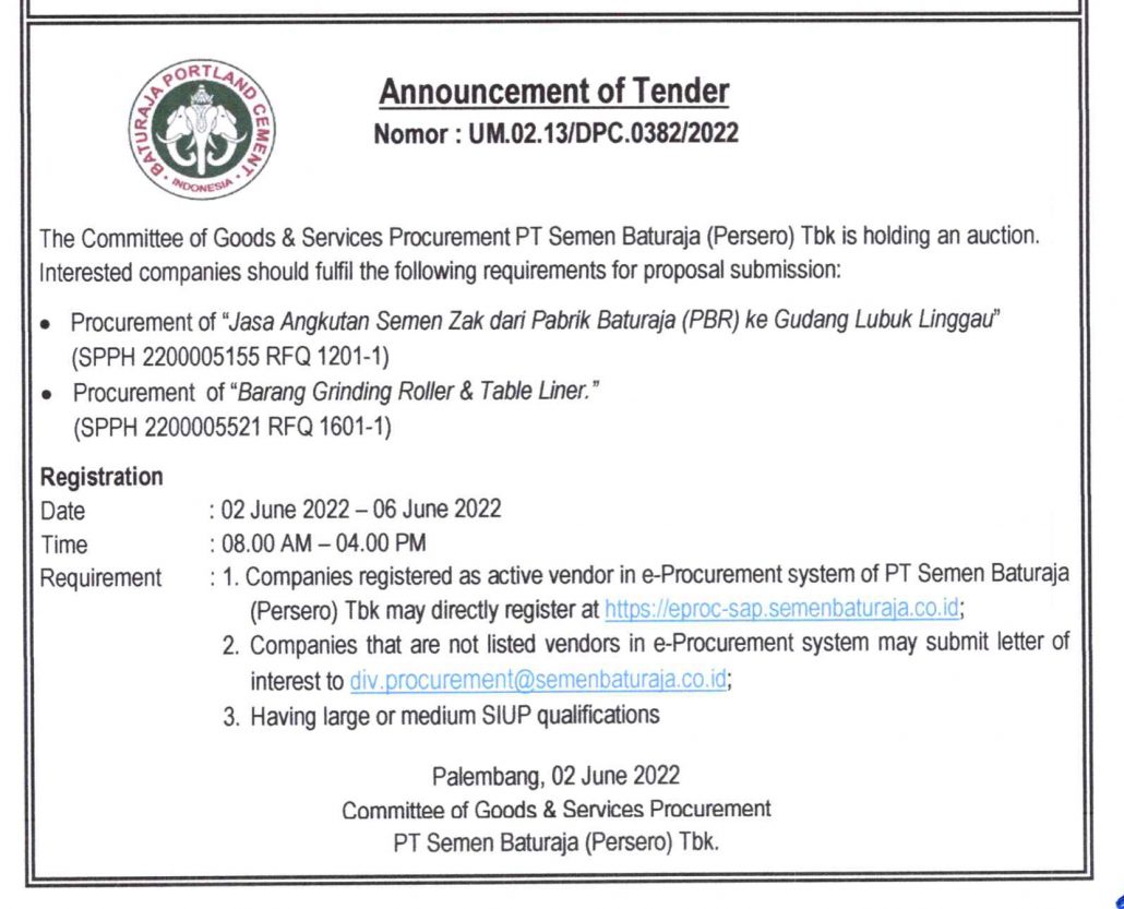 The committee procurement of Goods & Services PT Semen Baturaja (Persero) Tbk will held the auctions, for the company that are interested can be follow the auction with an explanation as follows: