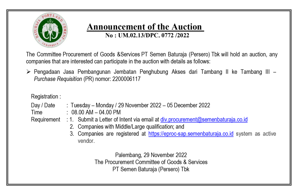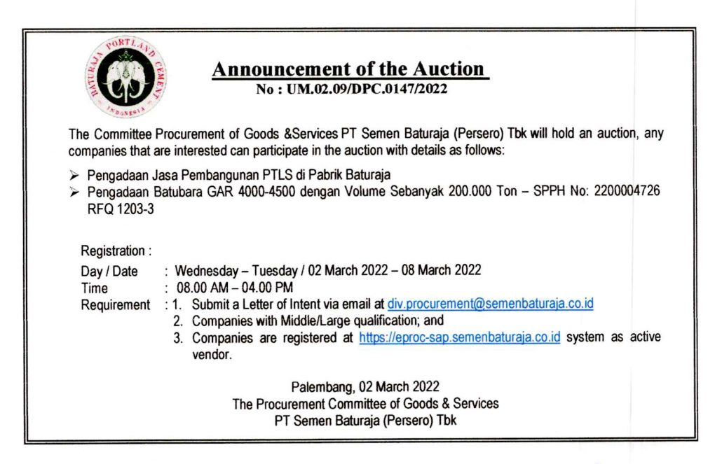 The committee procurement of Goods & Services PT Semen Baturaja Tbk will held the auctions, for the company that are interested can be follow the auction with an explanation as follows: