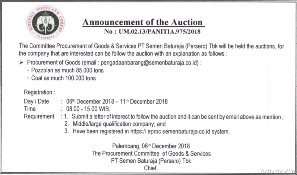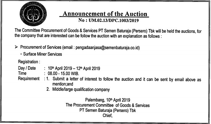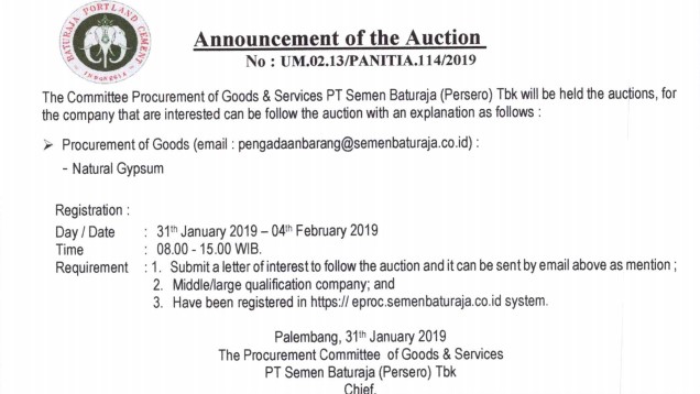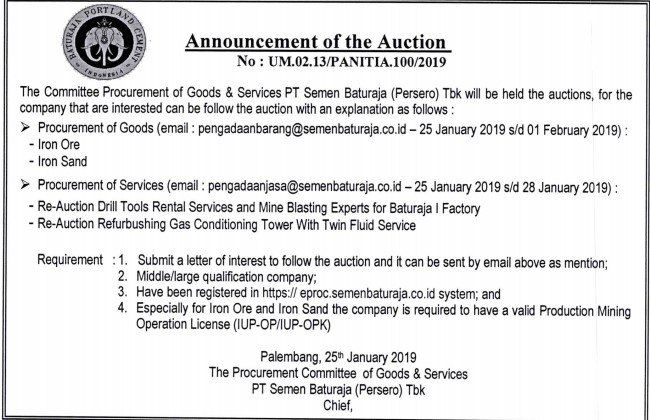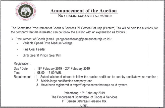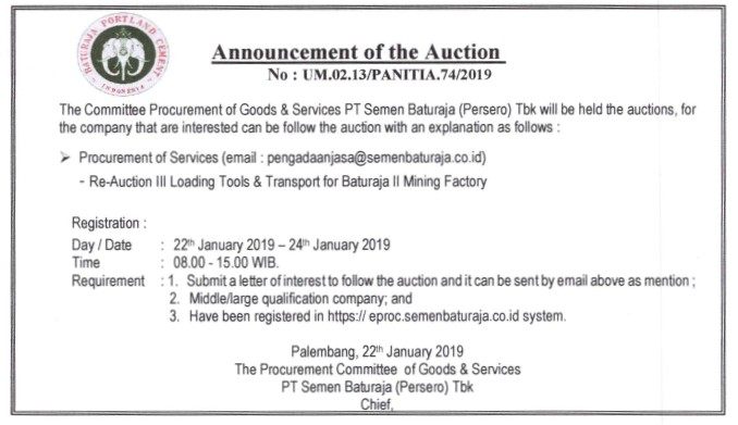 The committee procurement of Goods & Services PT Semen Baturaja (Persero) Tbk will held the auctions, for the company that are interested can be follow the auction with an explanation as follows: